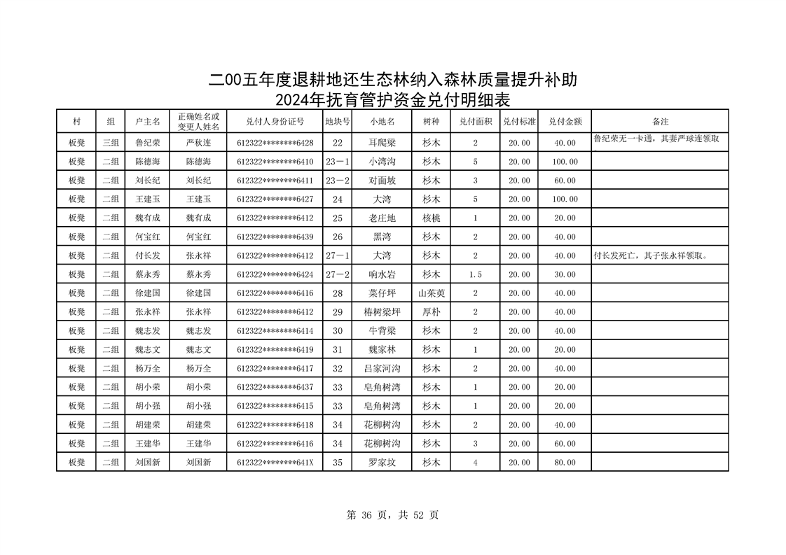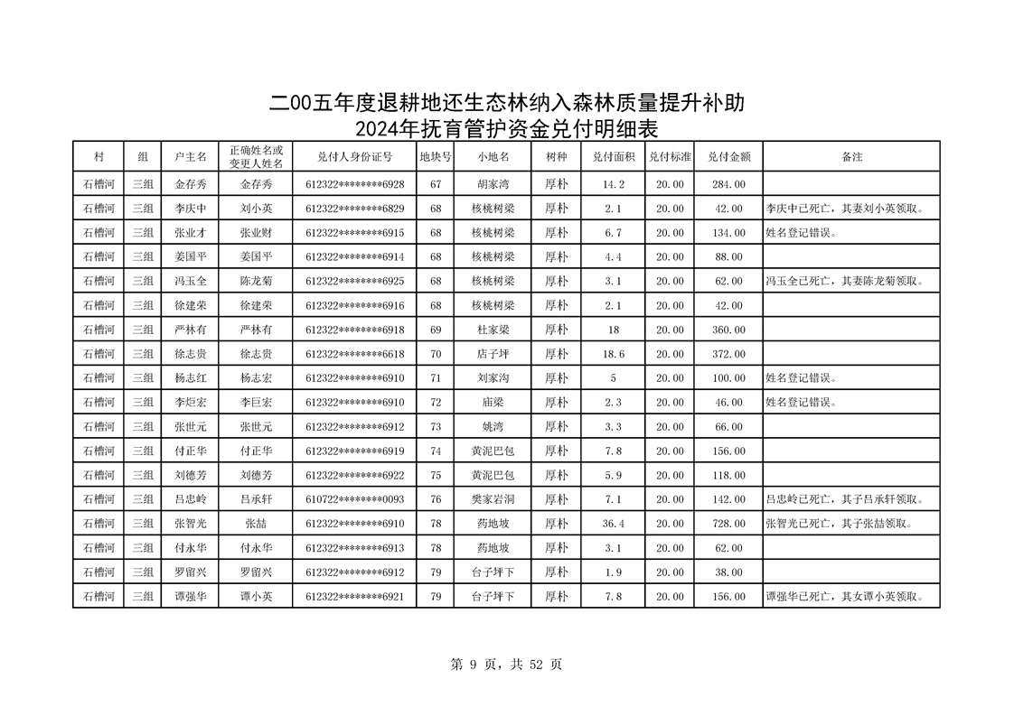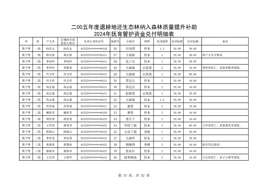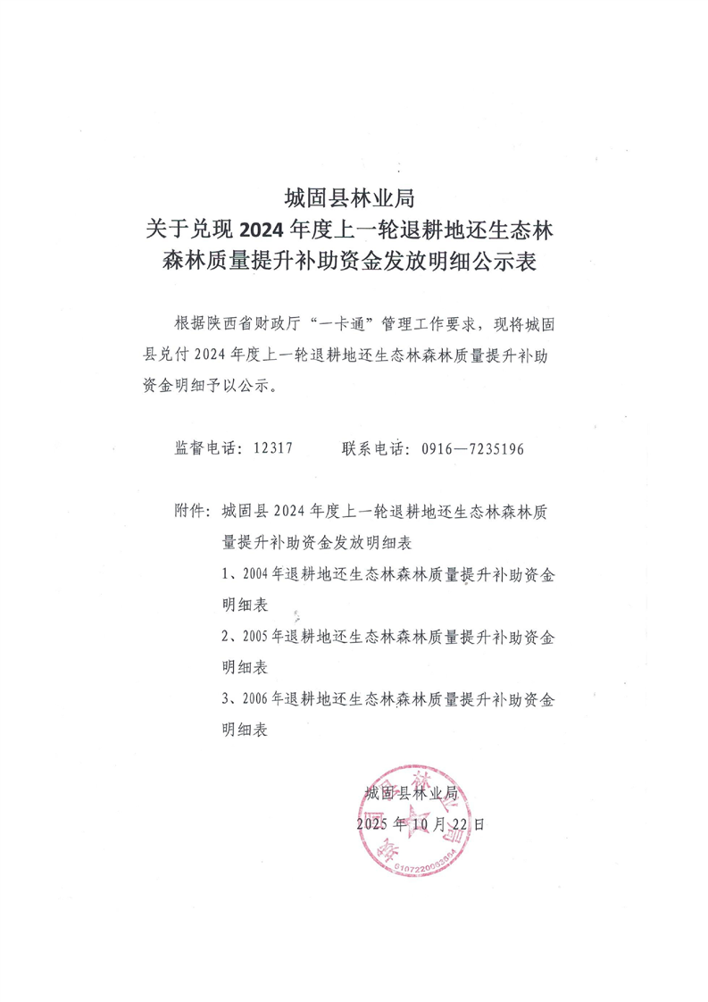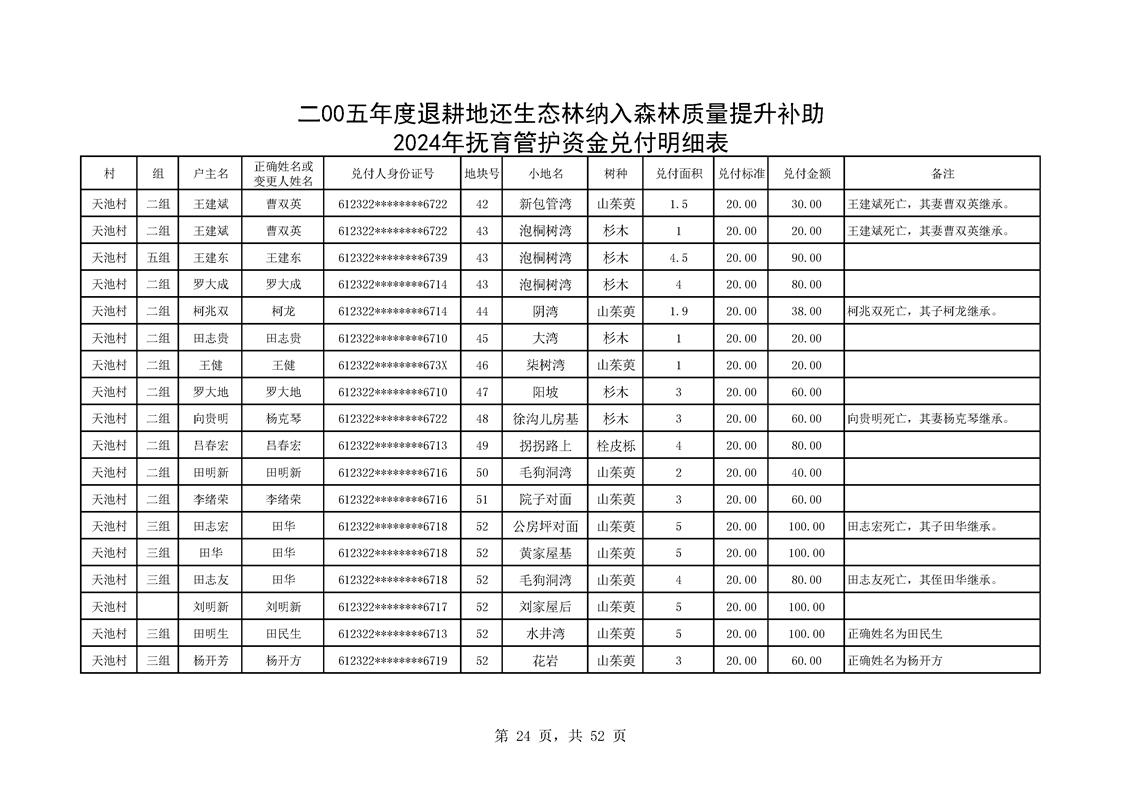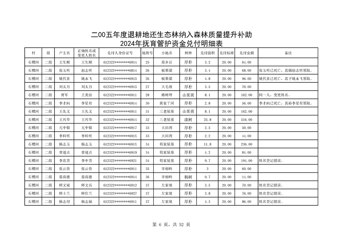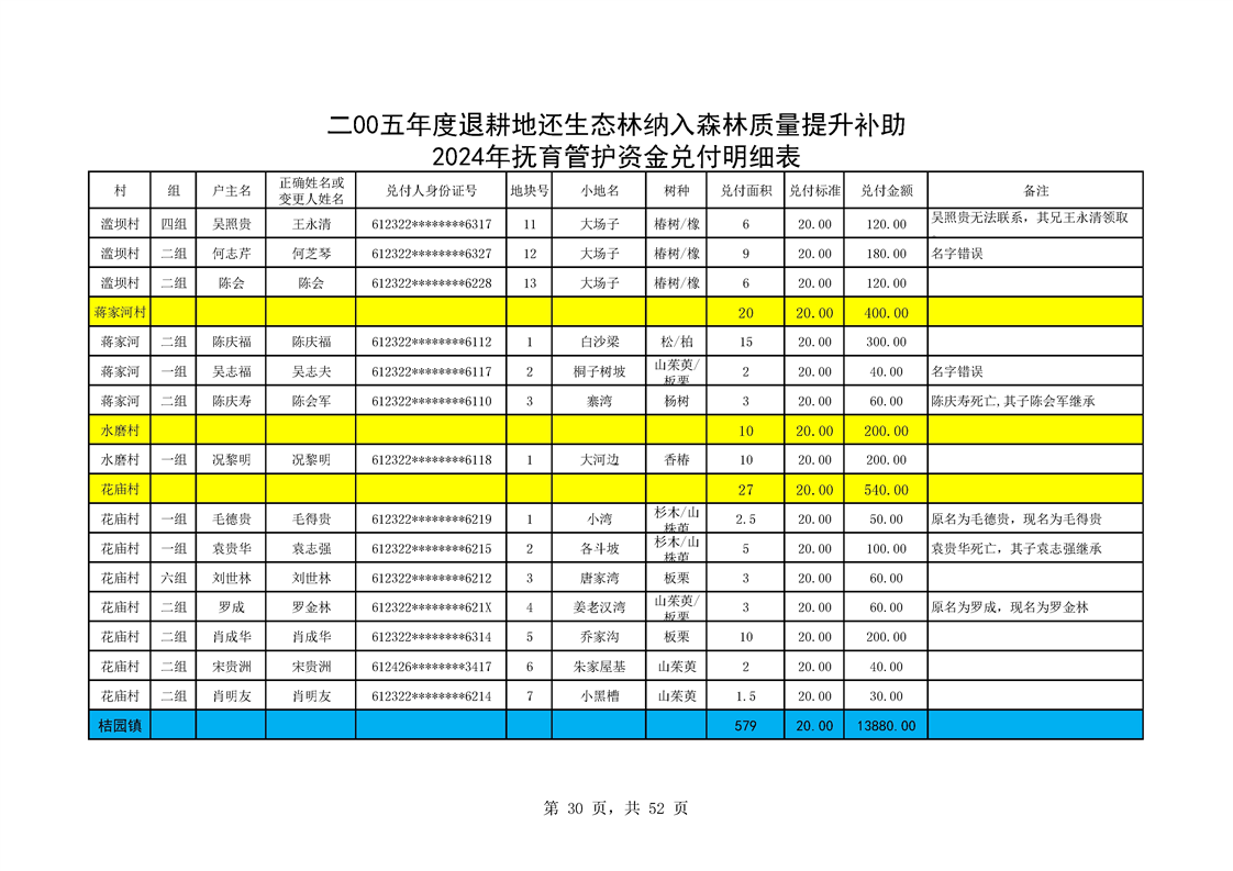 城固县林业局关于兑现2024年度上一轮退耕地还生态林森林质量提升补助资金发放明细公示