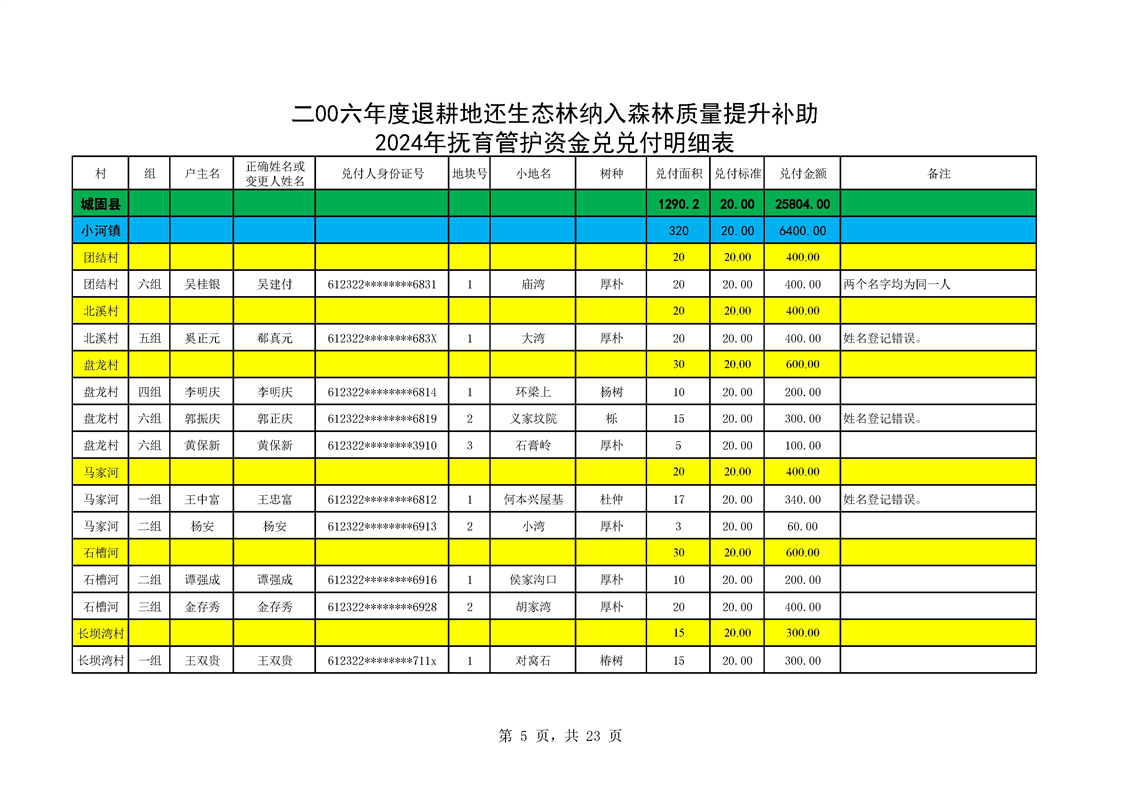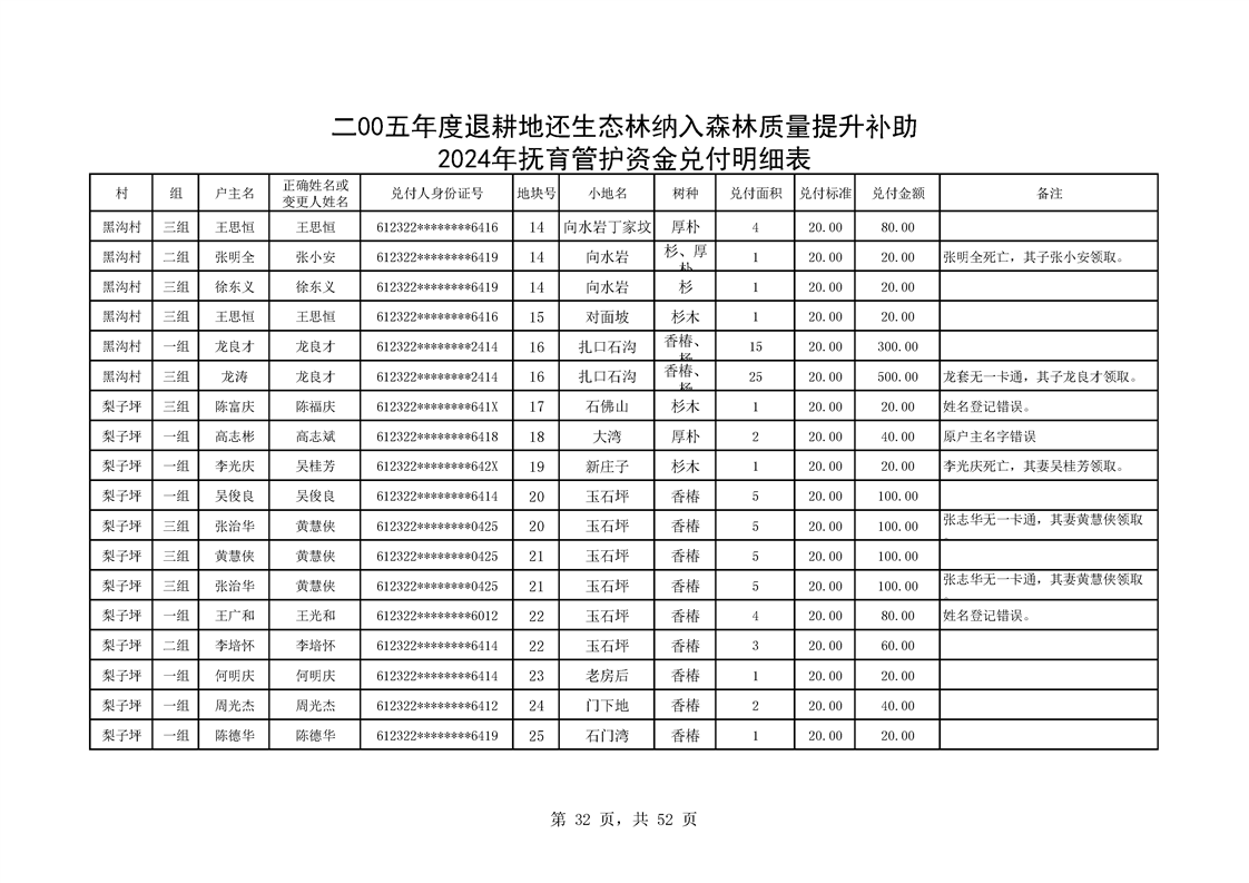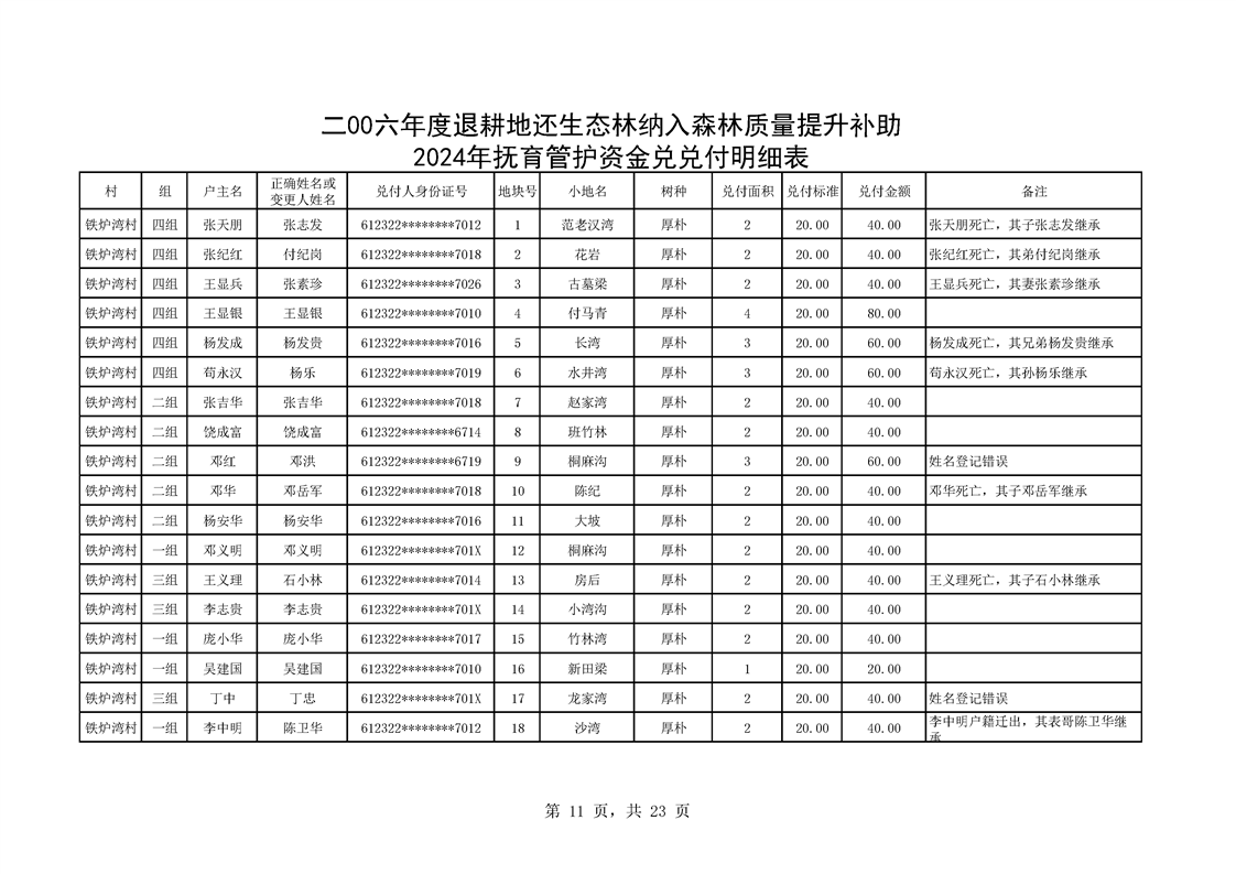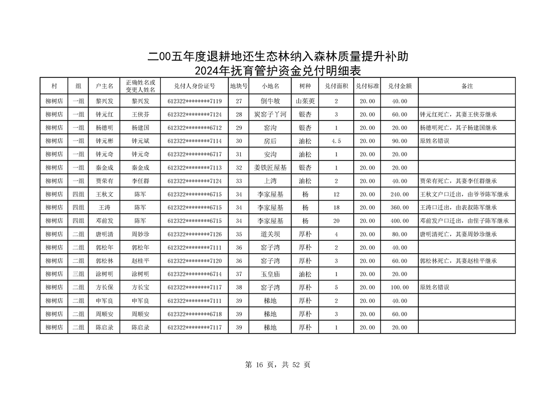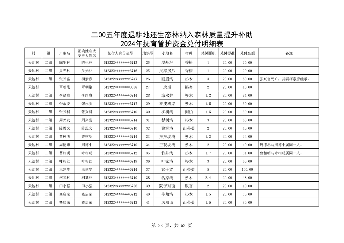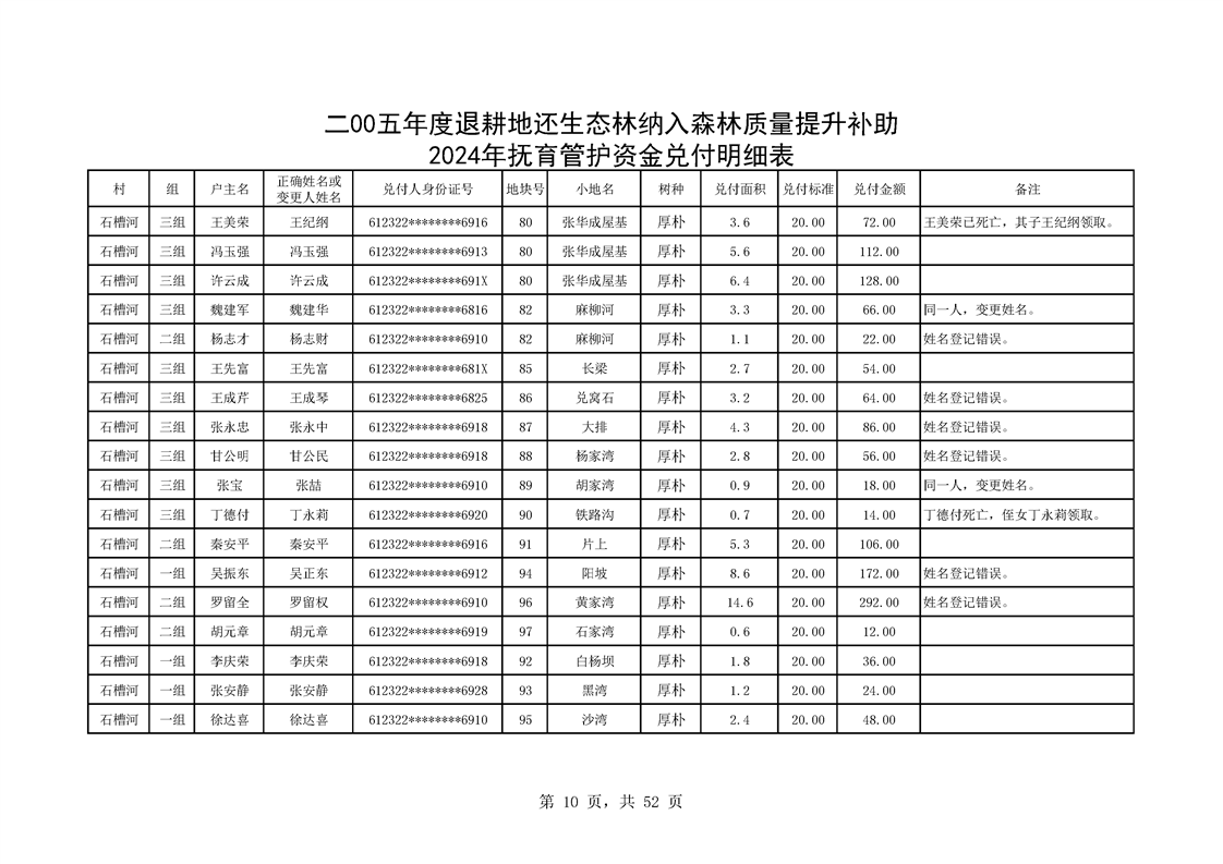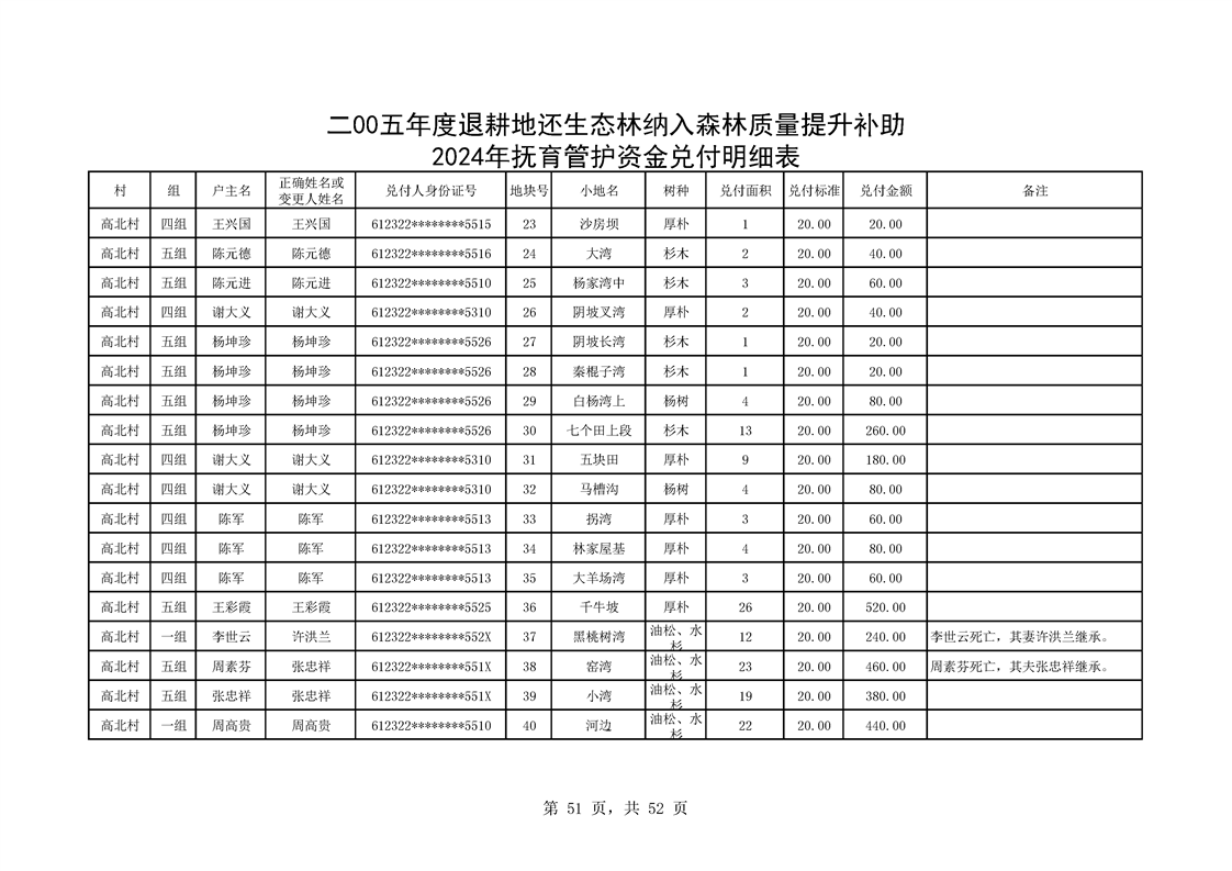 城固县林业局关于兑现2024年度上一轮退耕地还生态林森林质量提升补助资金发放明细公示