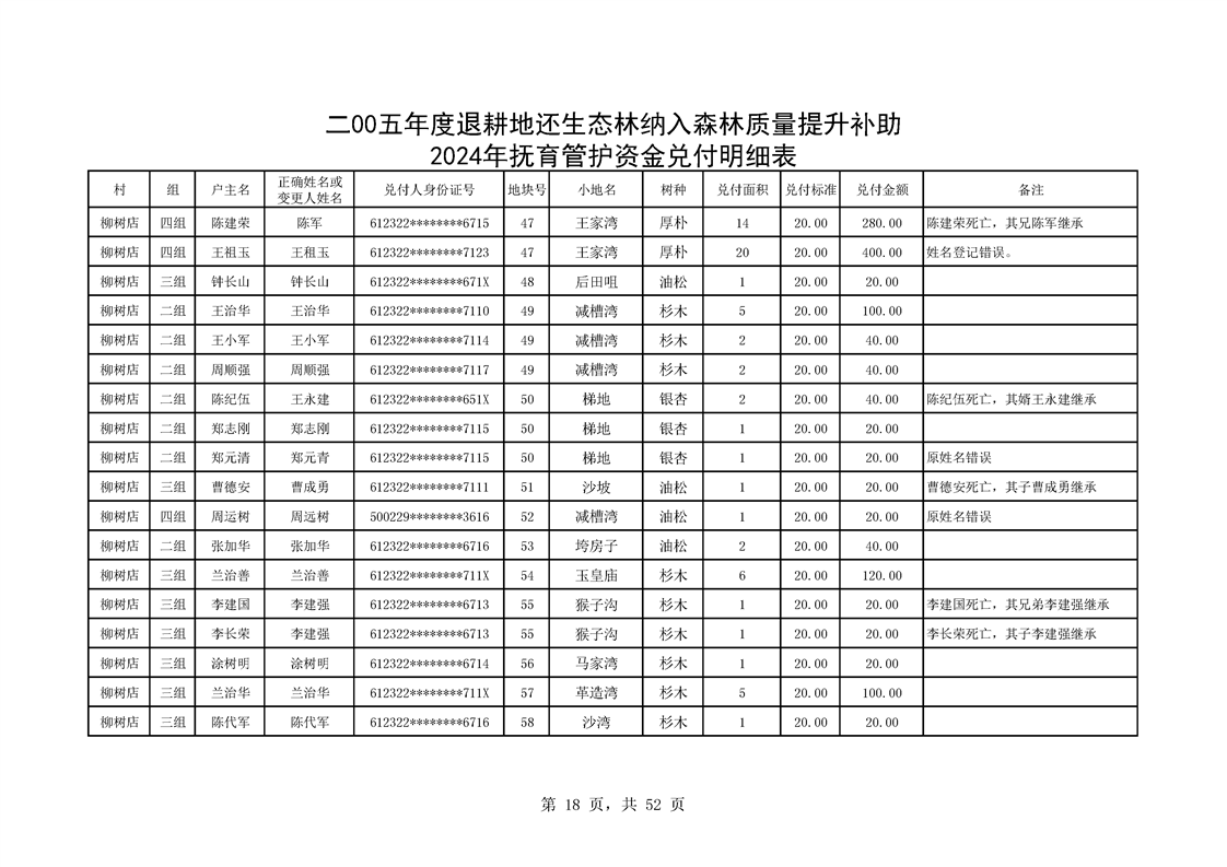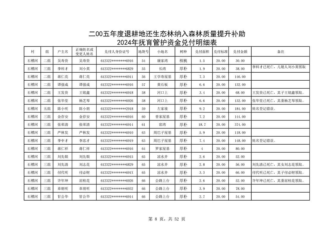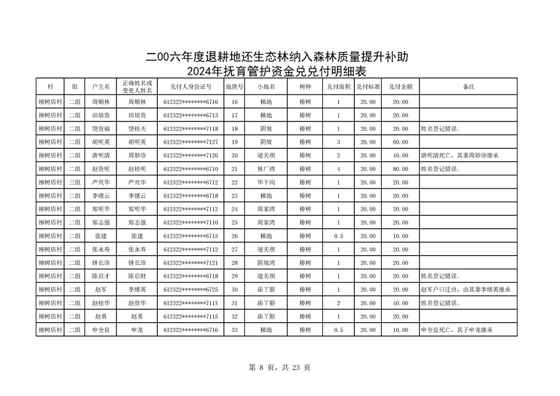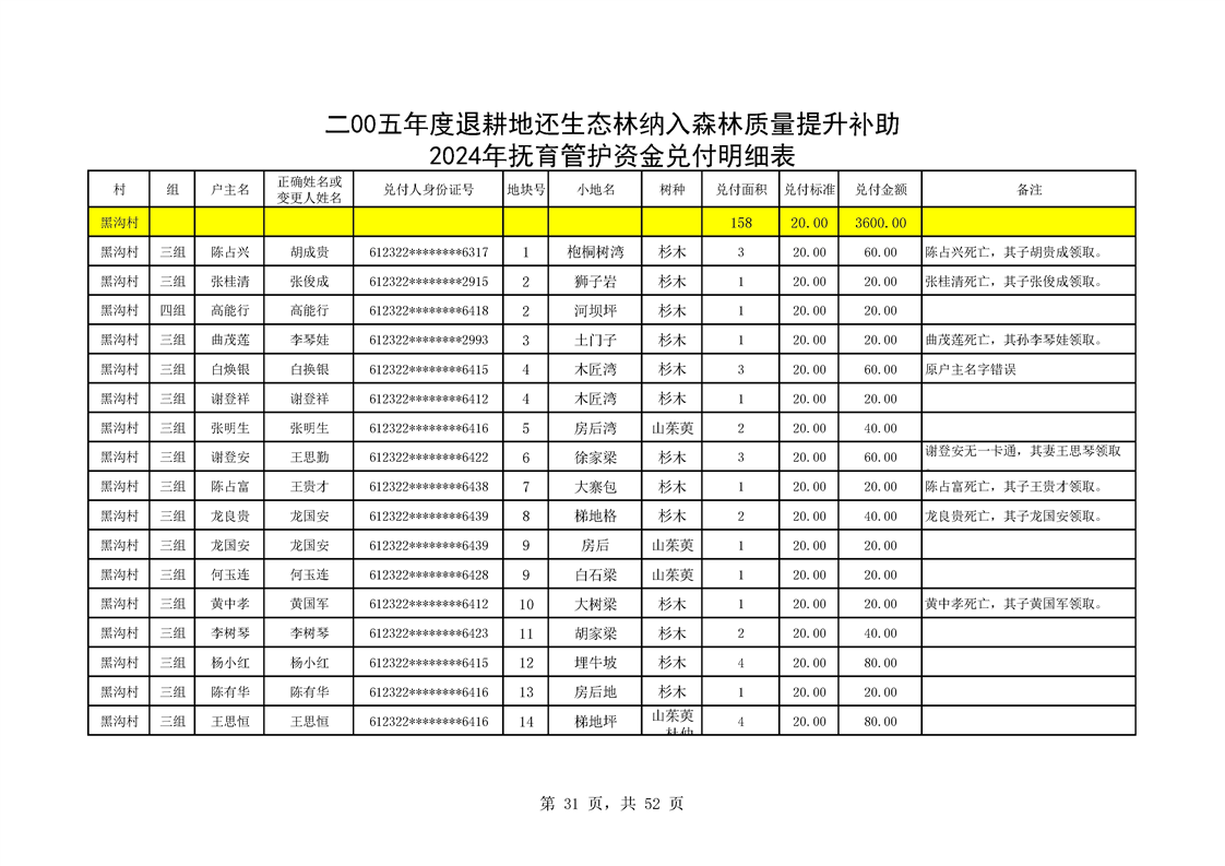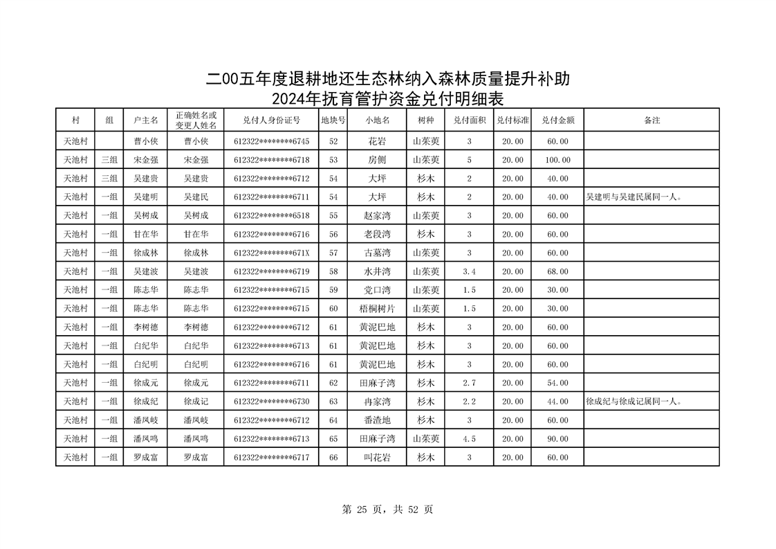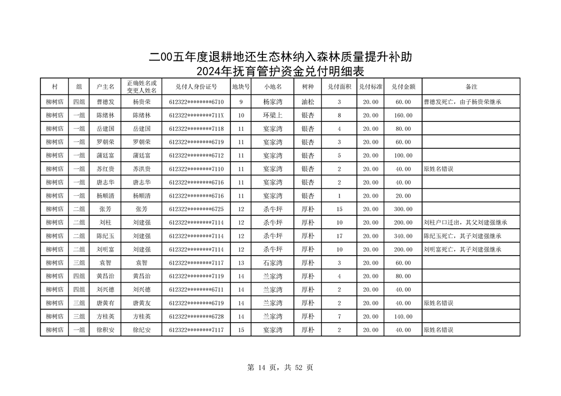 城固县林业局关于兑现2024年度上一轮退耕地还生态林森林质量提升补助资金发放明细公示
