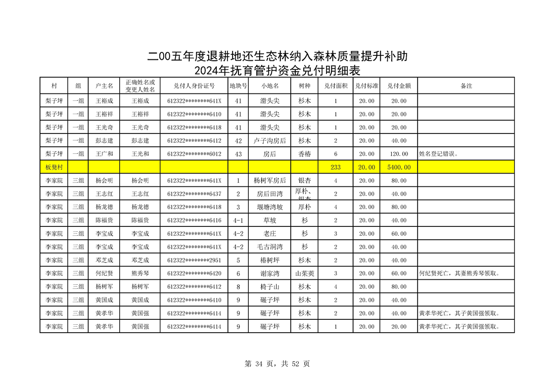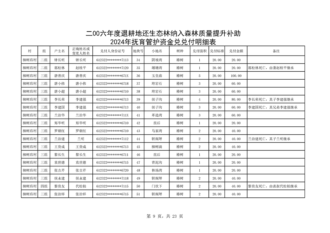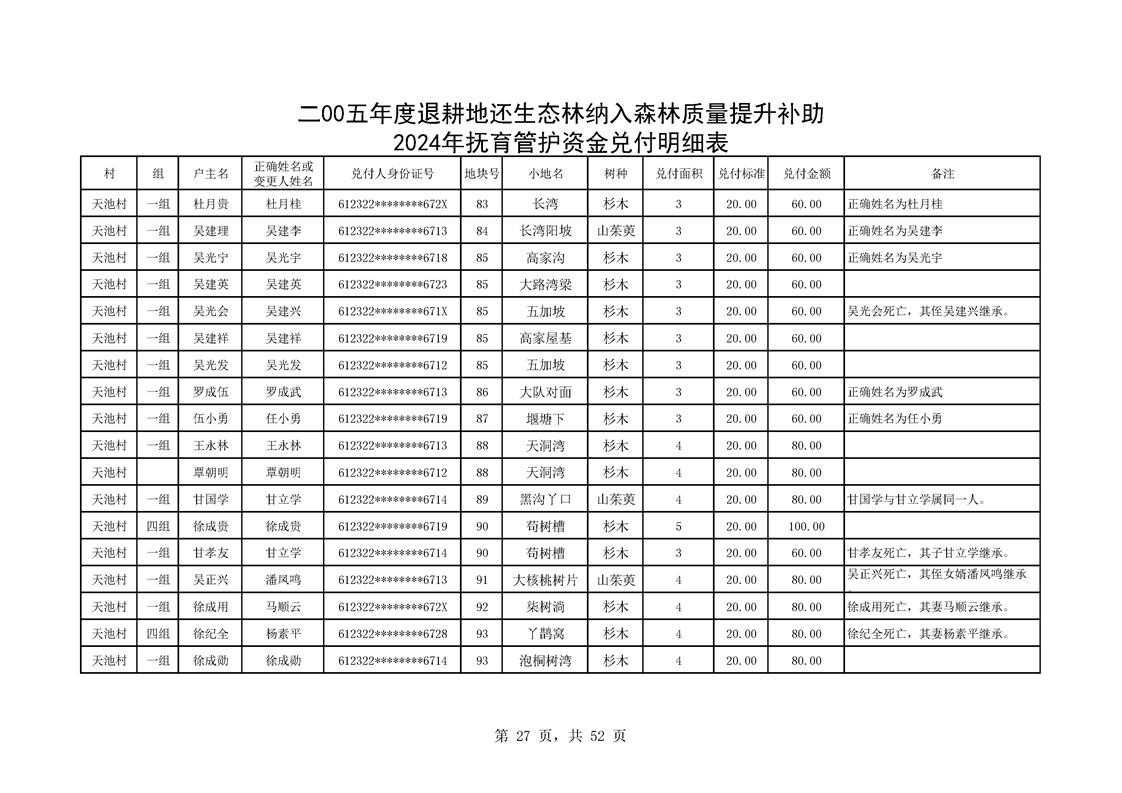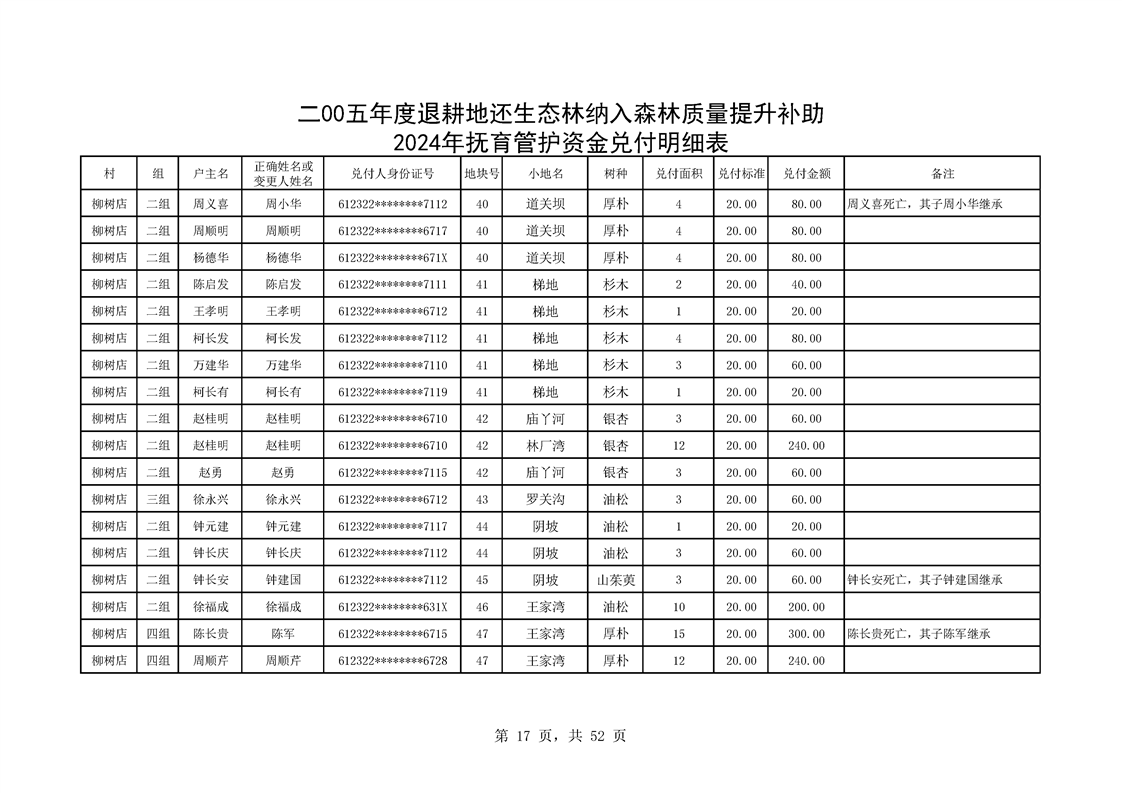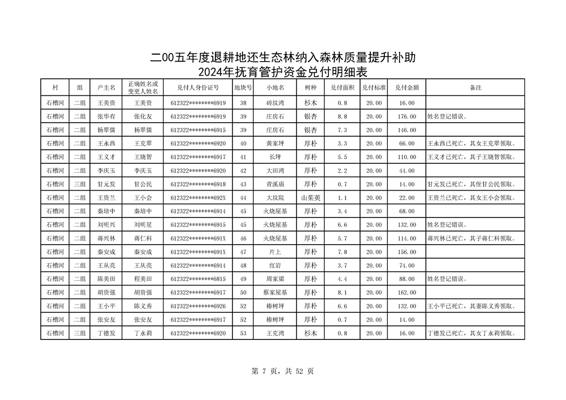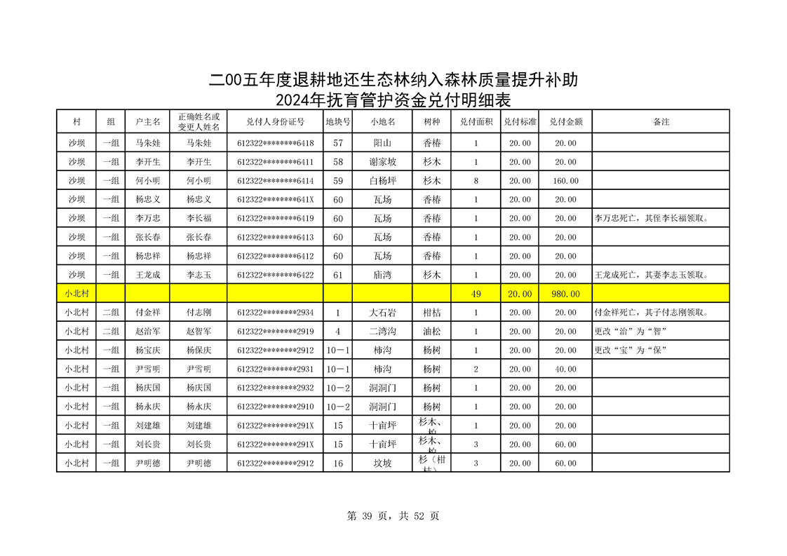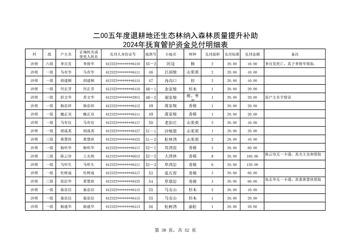 城固县林业局关于兑现2024年度上一轮退耕地还生态林森林质量提升补助资金发放明细公示