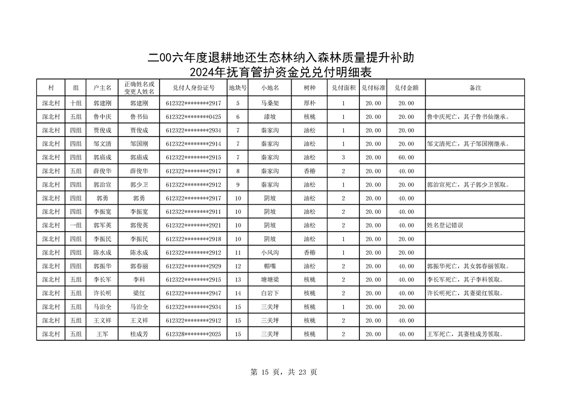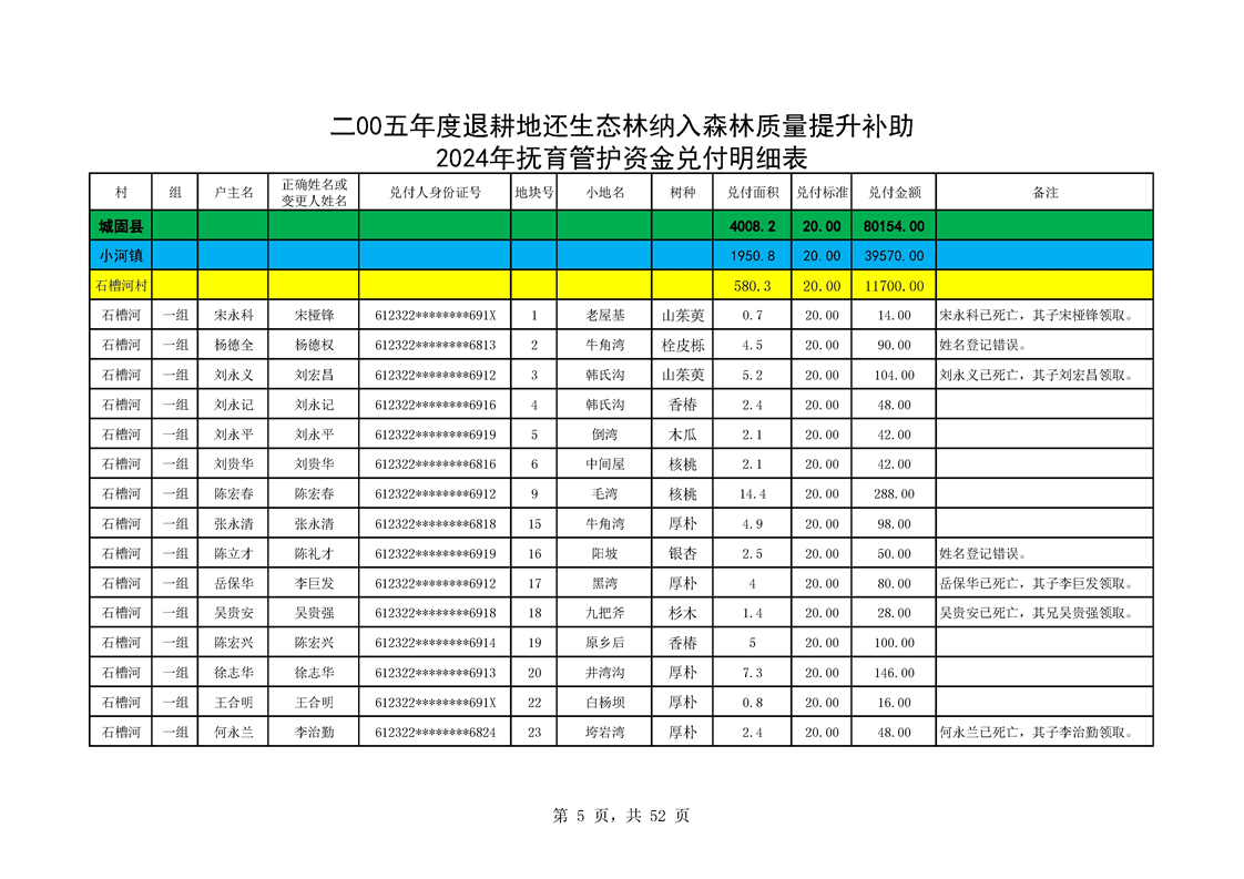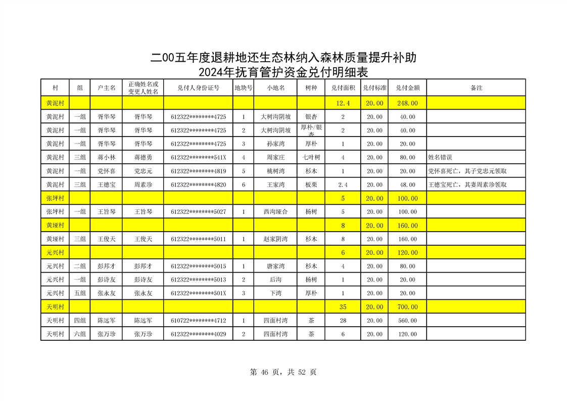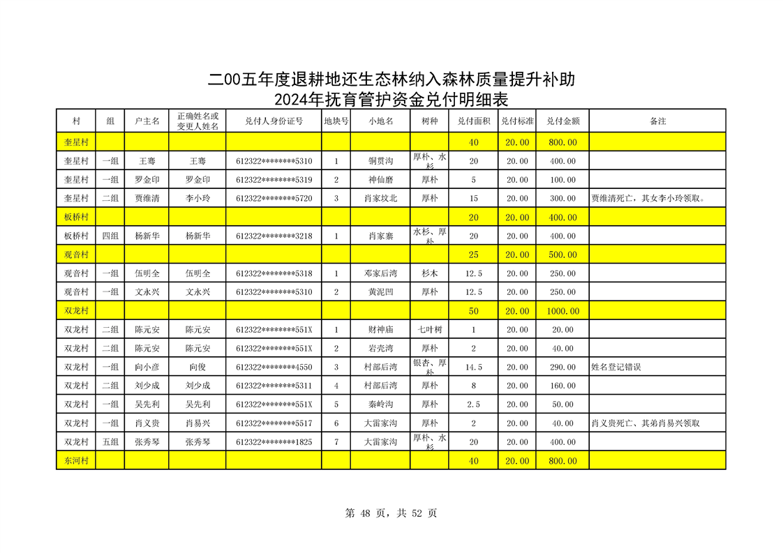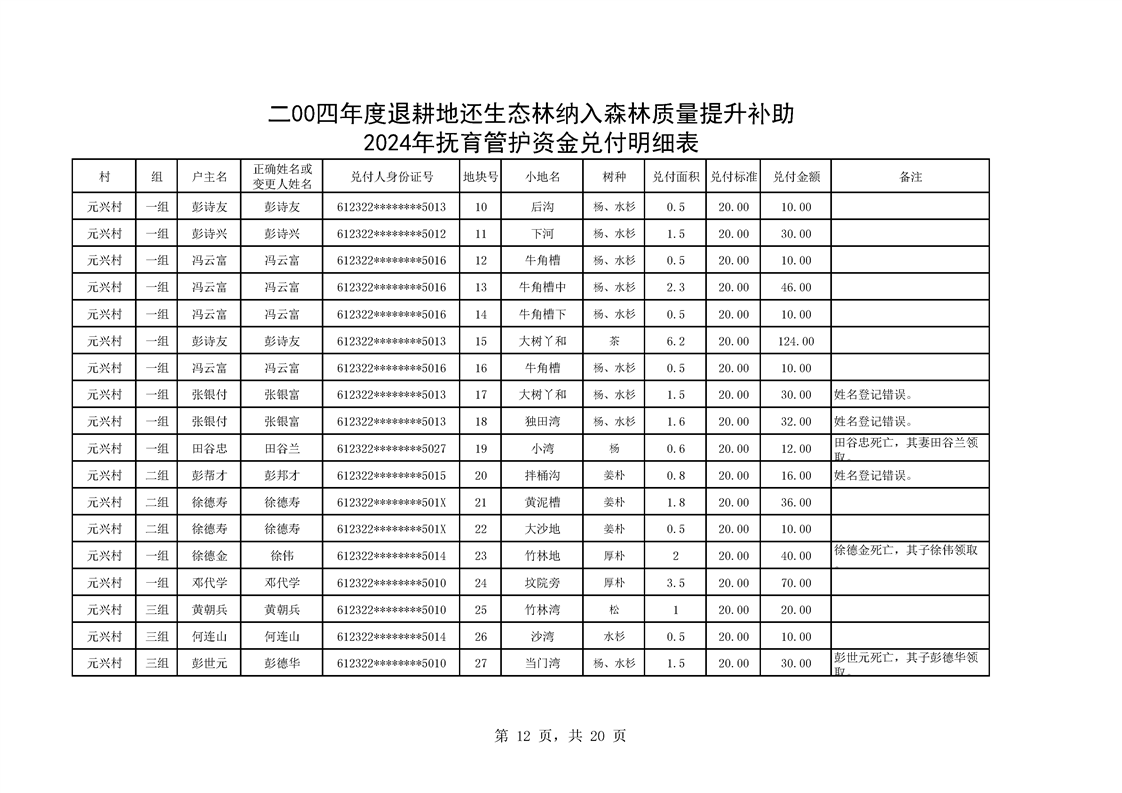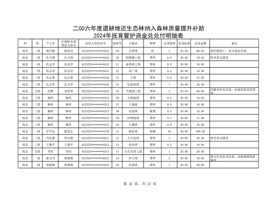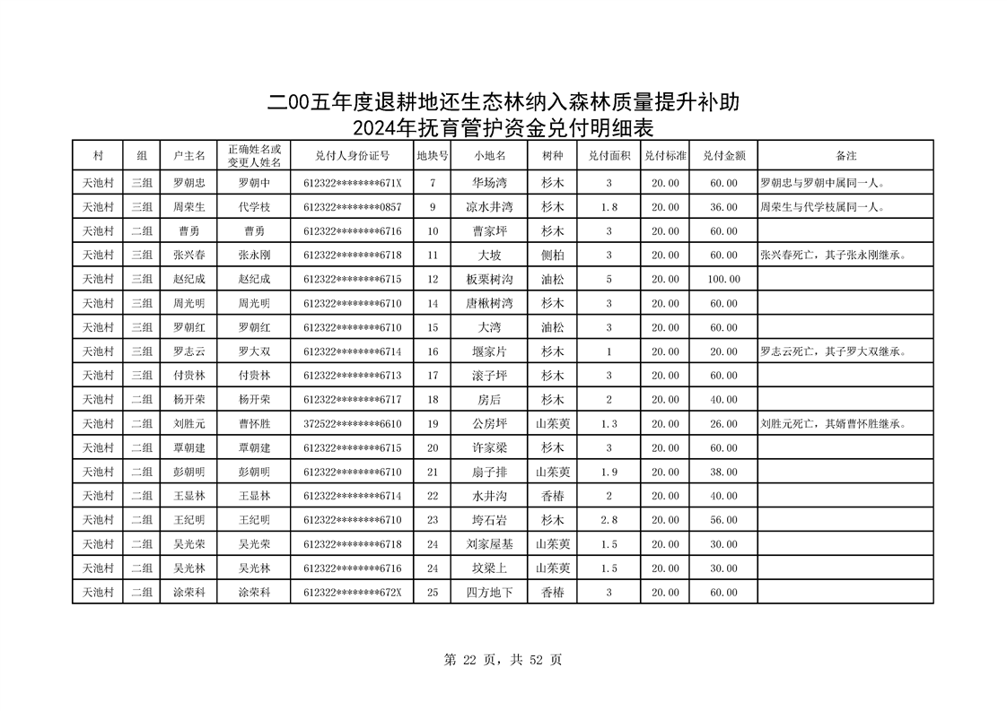 城固县林业局关于兑现2024年度上一轮退耕地还生态林森林质量提升补助资金发放明细公示