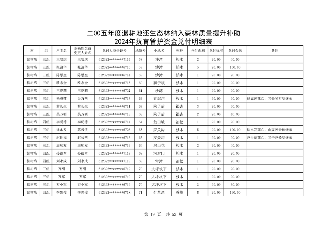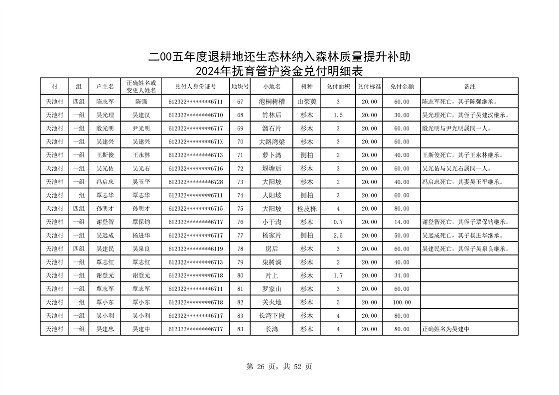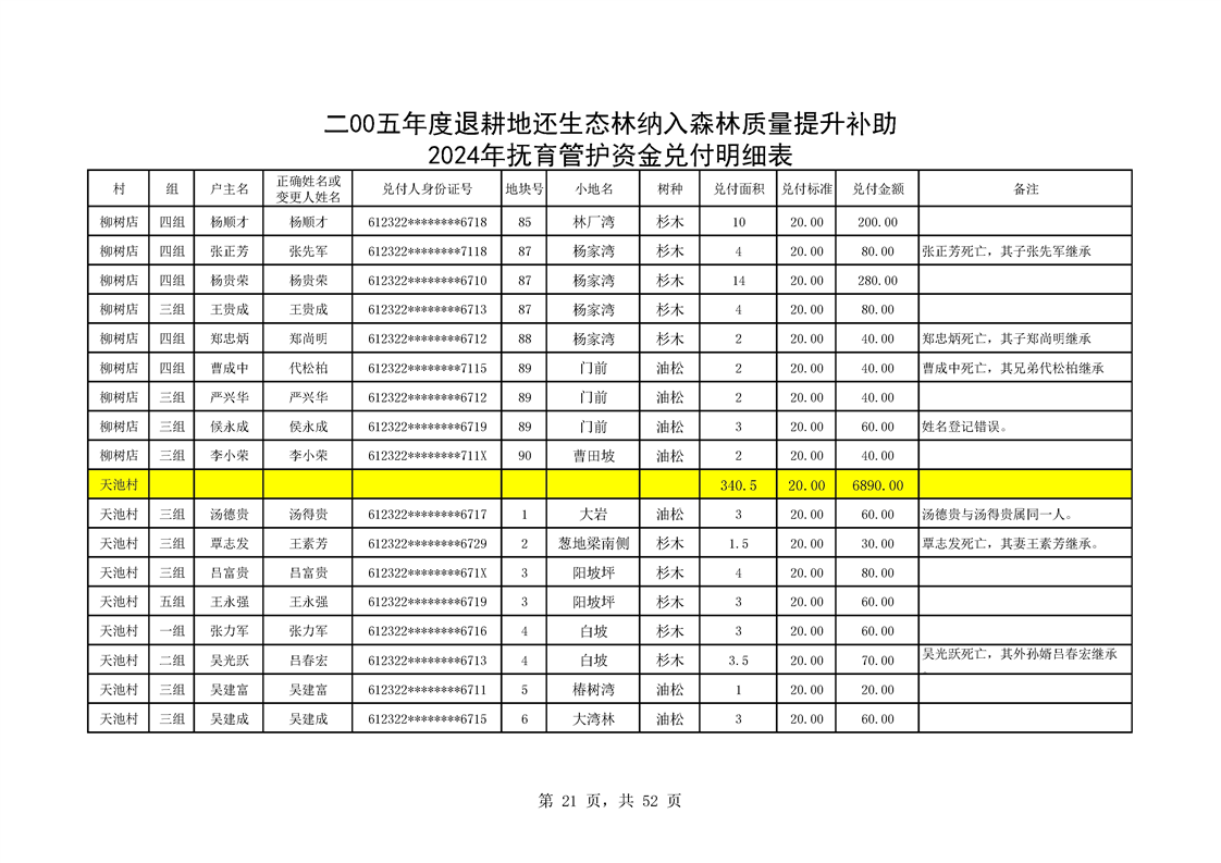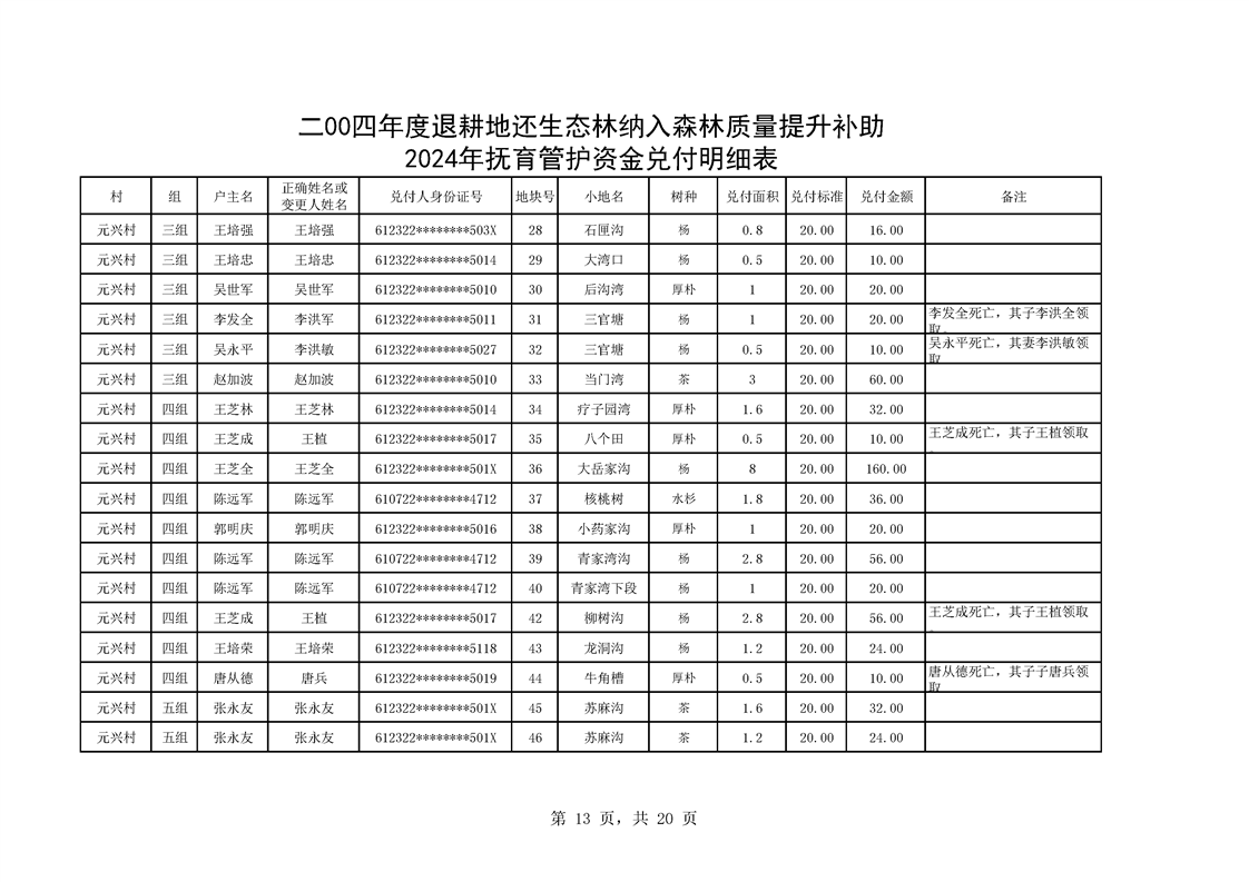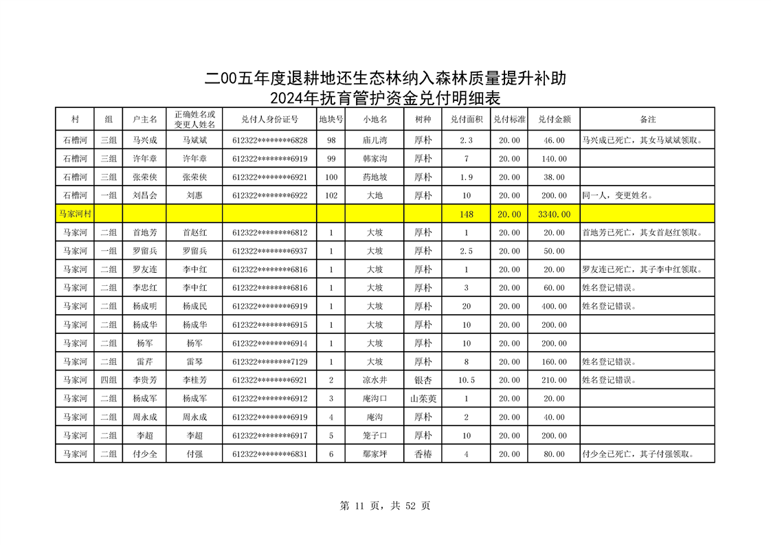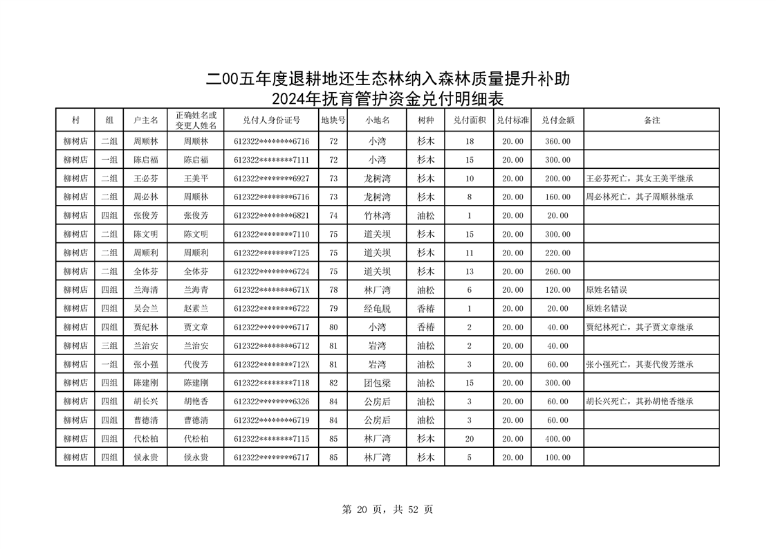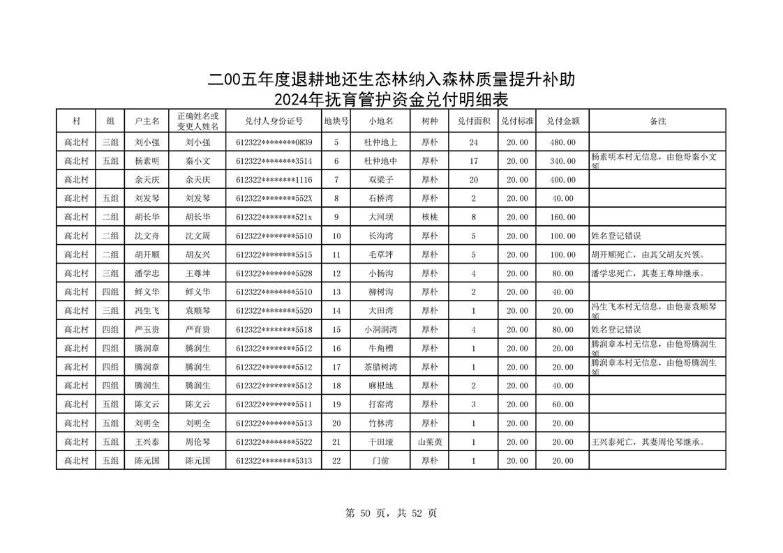 城固县林业局关于兑现2024年度上一轮退耕地还生态林森林质量提升补助资金发放明细公示