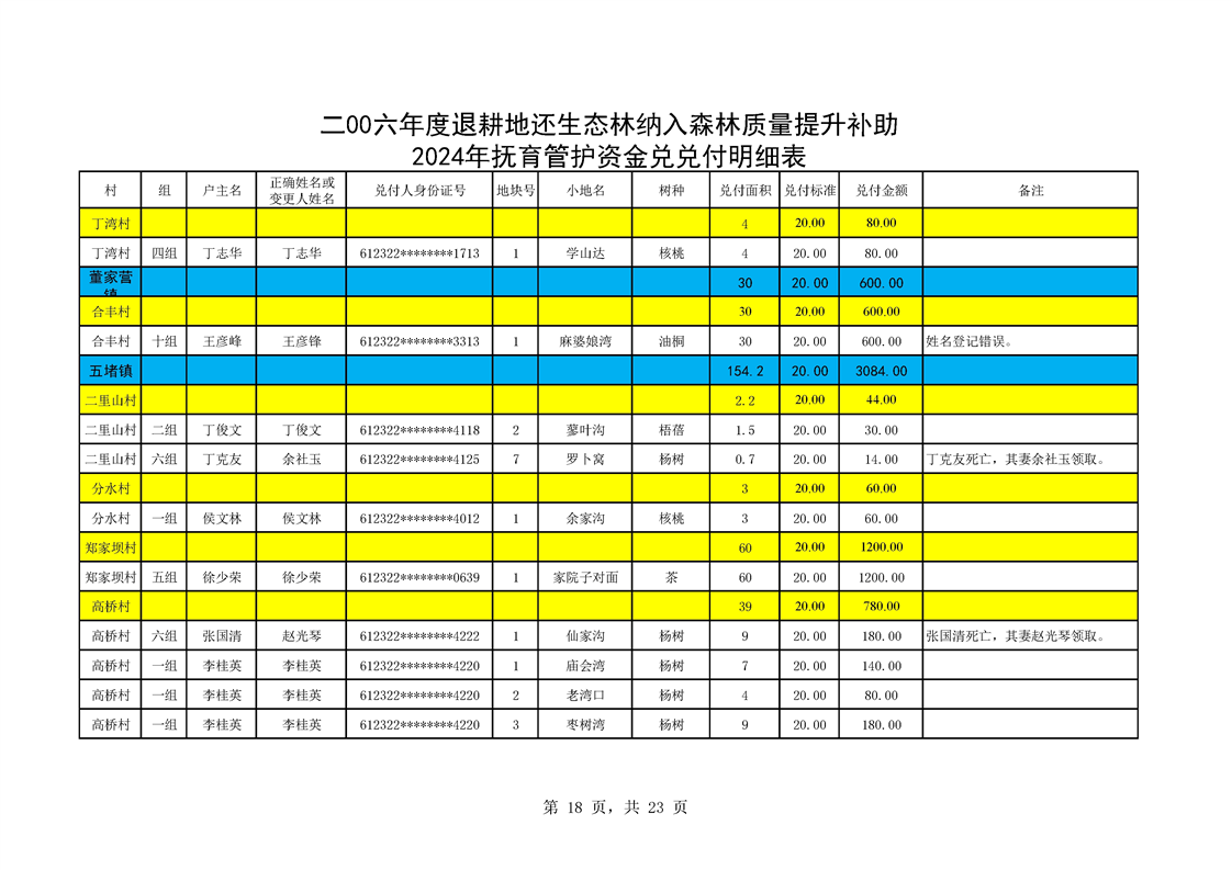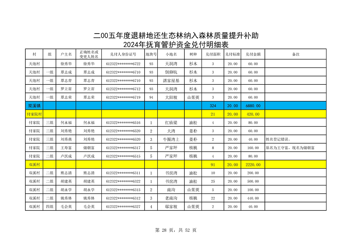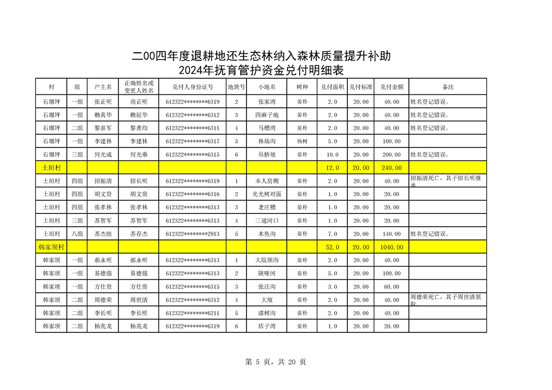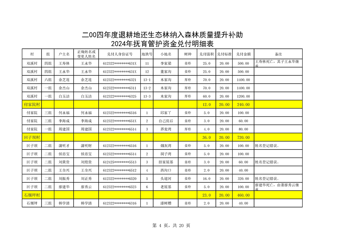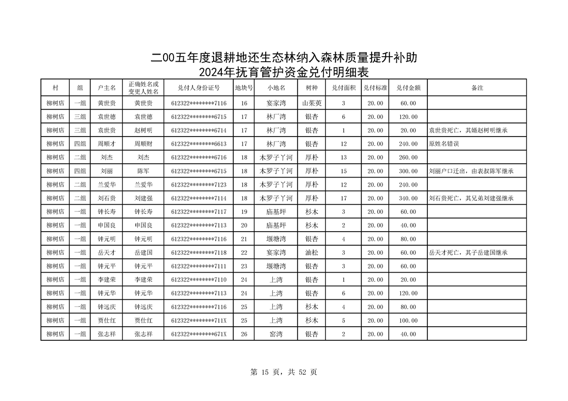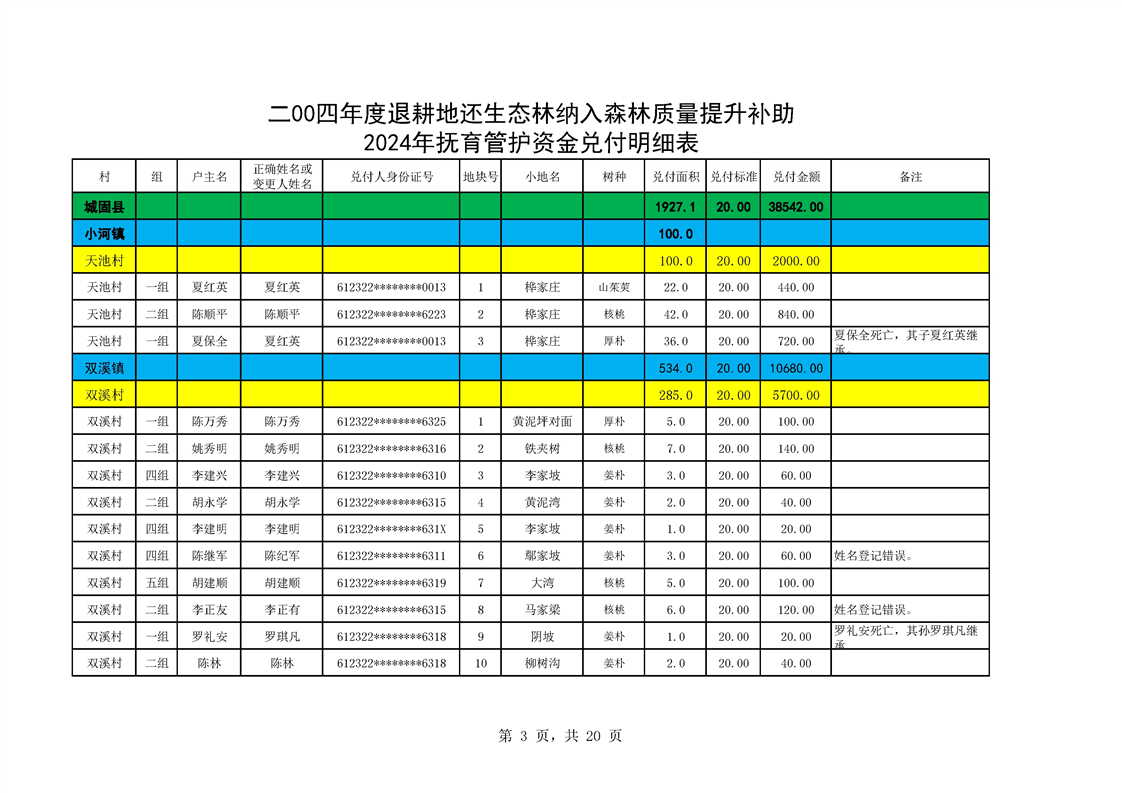 城固县林业局关于兑现2024年度上一轮退耕地还生态林森林质量提升补助资金发放明细公示