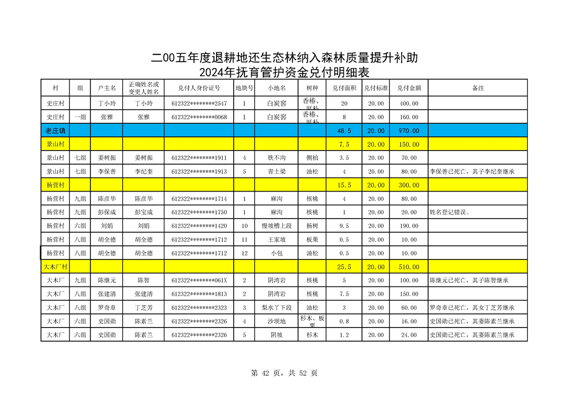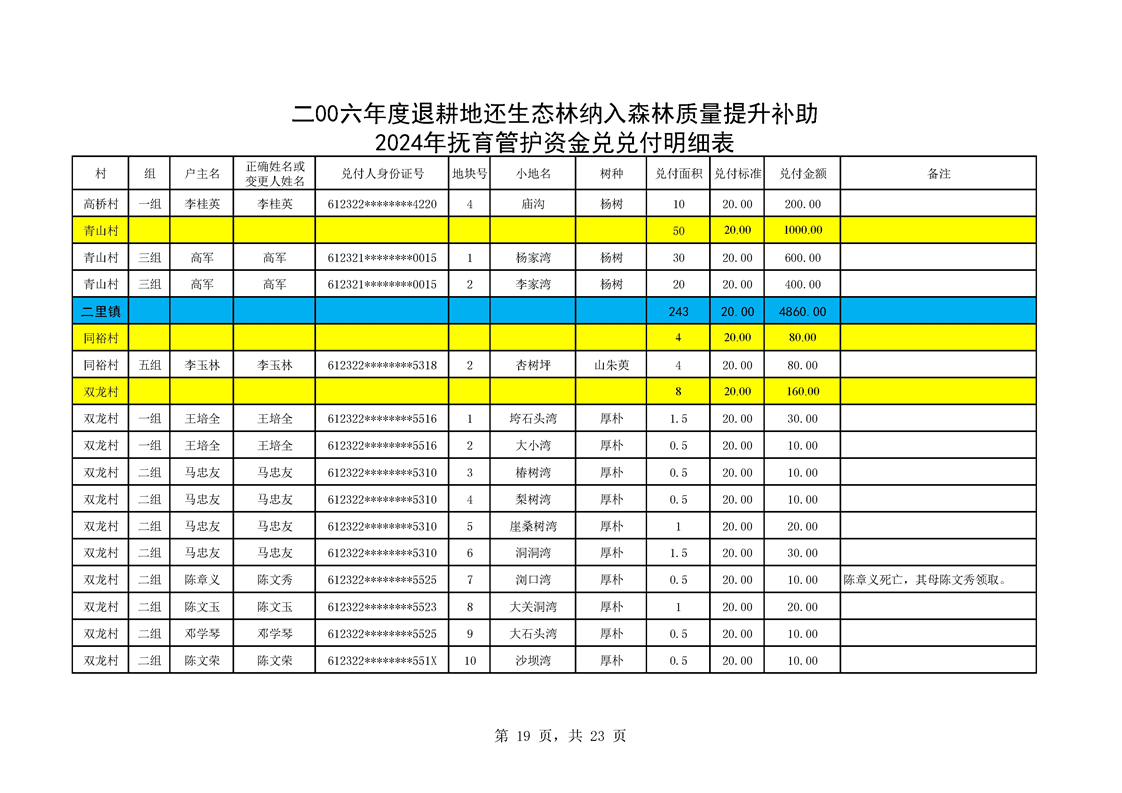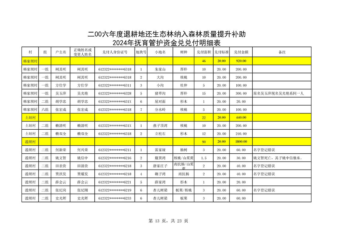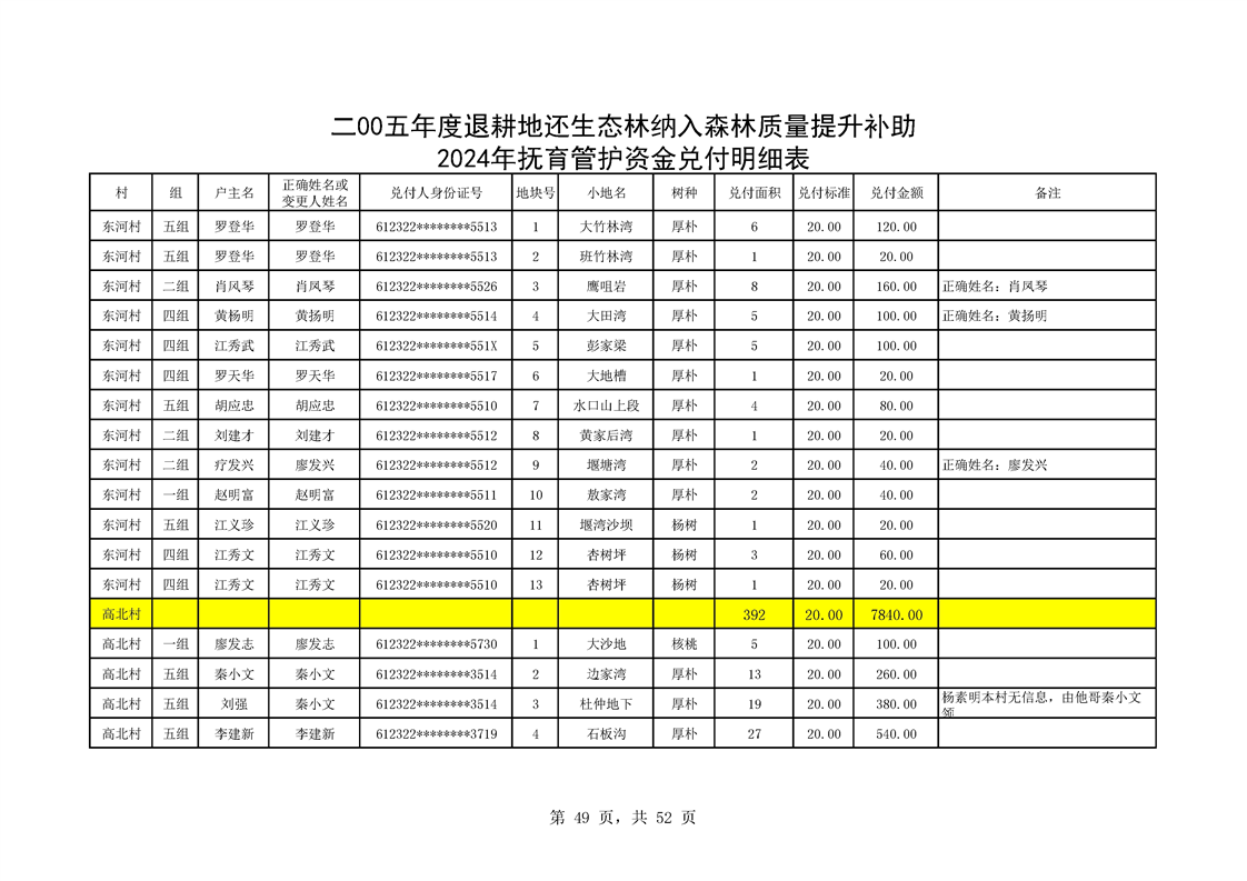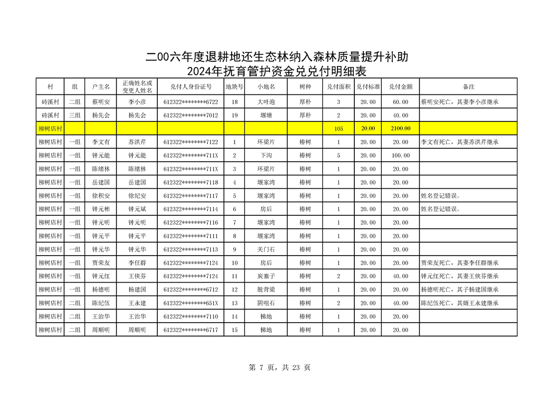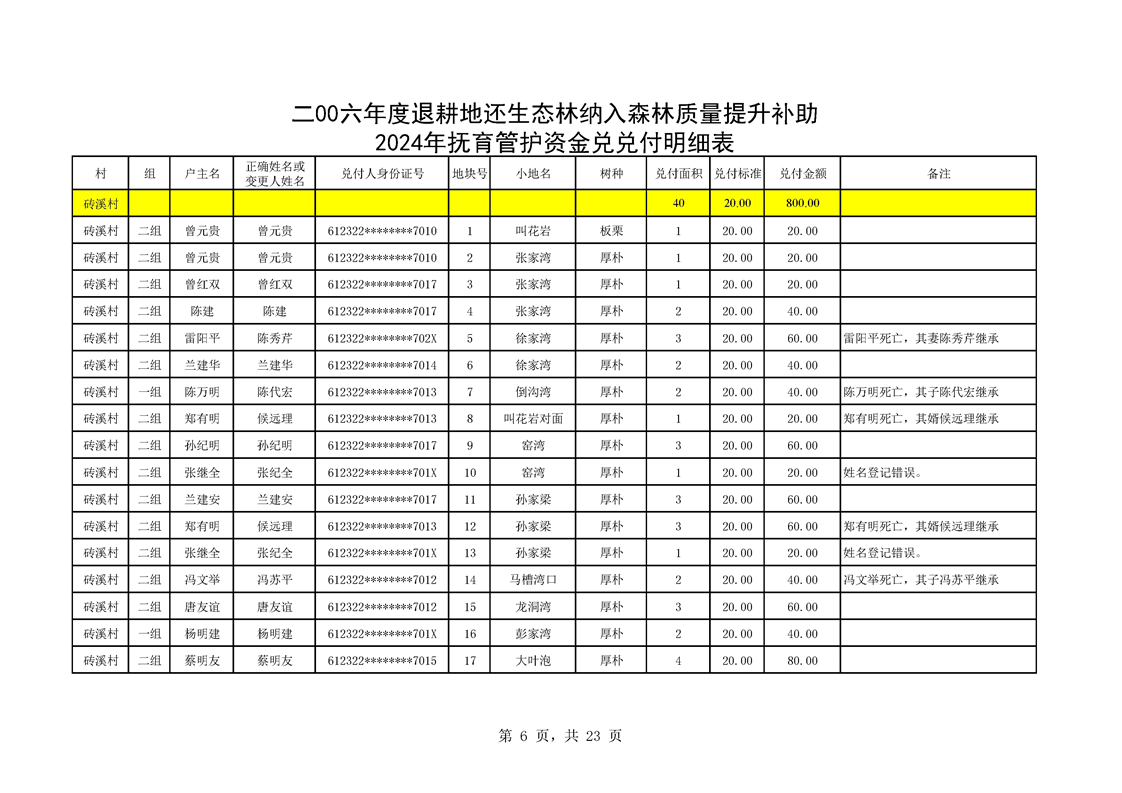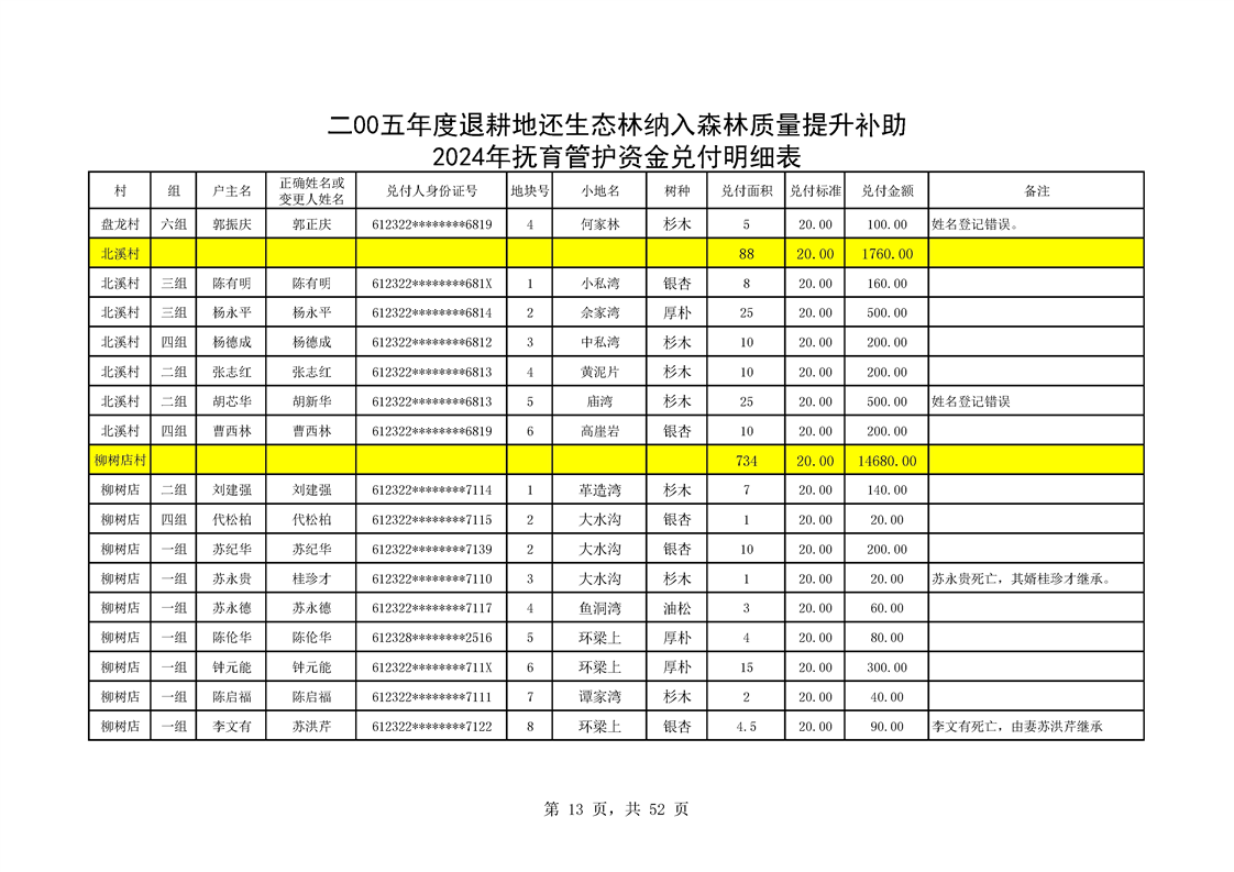 城固县林业局关于兑现2024年度上一轮退耕地还生态林森林质量提升补助资金发放明细公示
