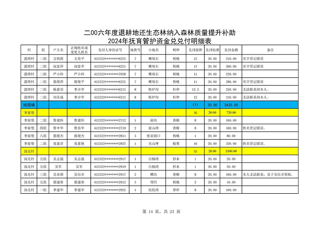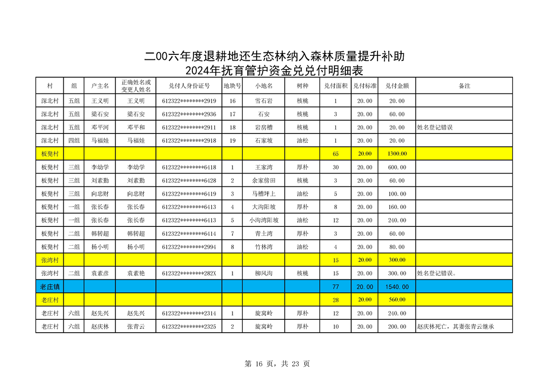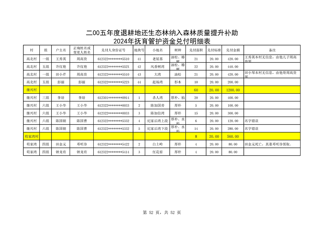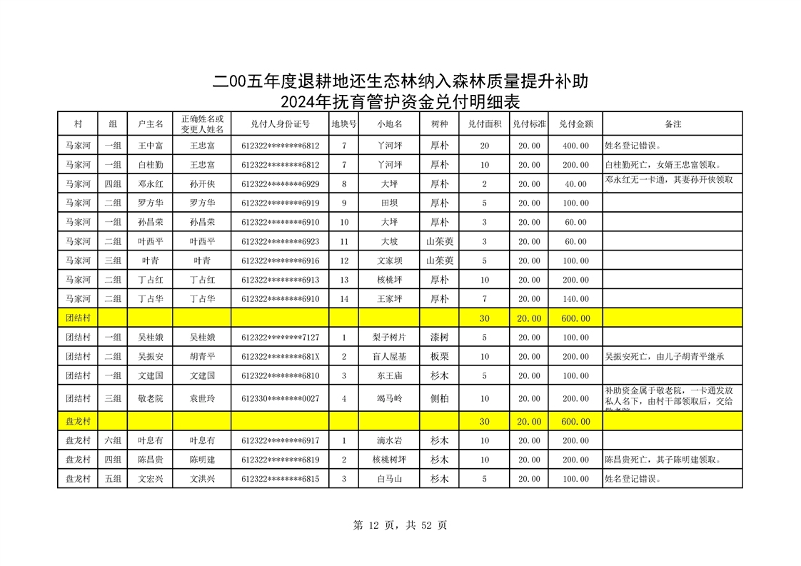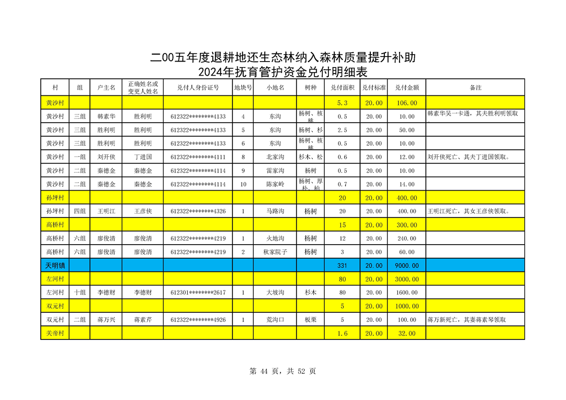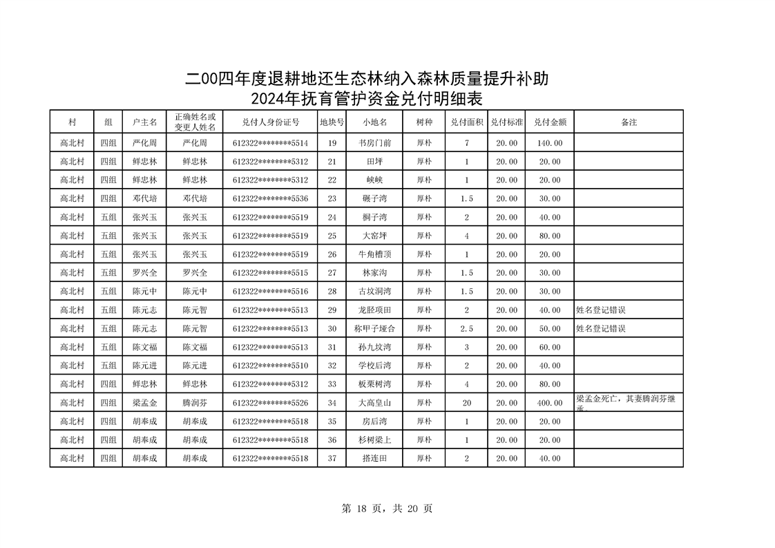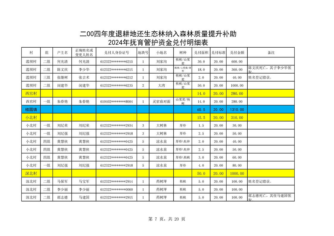城固县林业局关于兑现2024年度上一轮退耕地还生态林森林质量提升补助资金发放明细公示