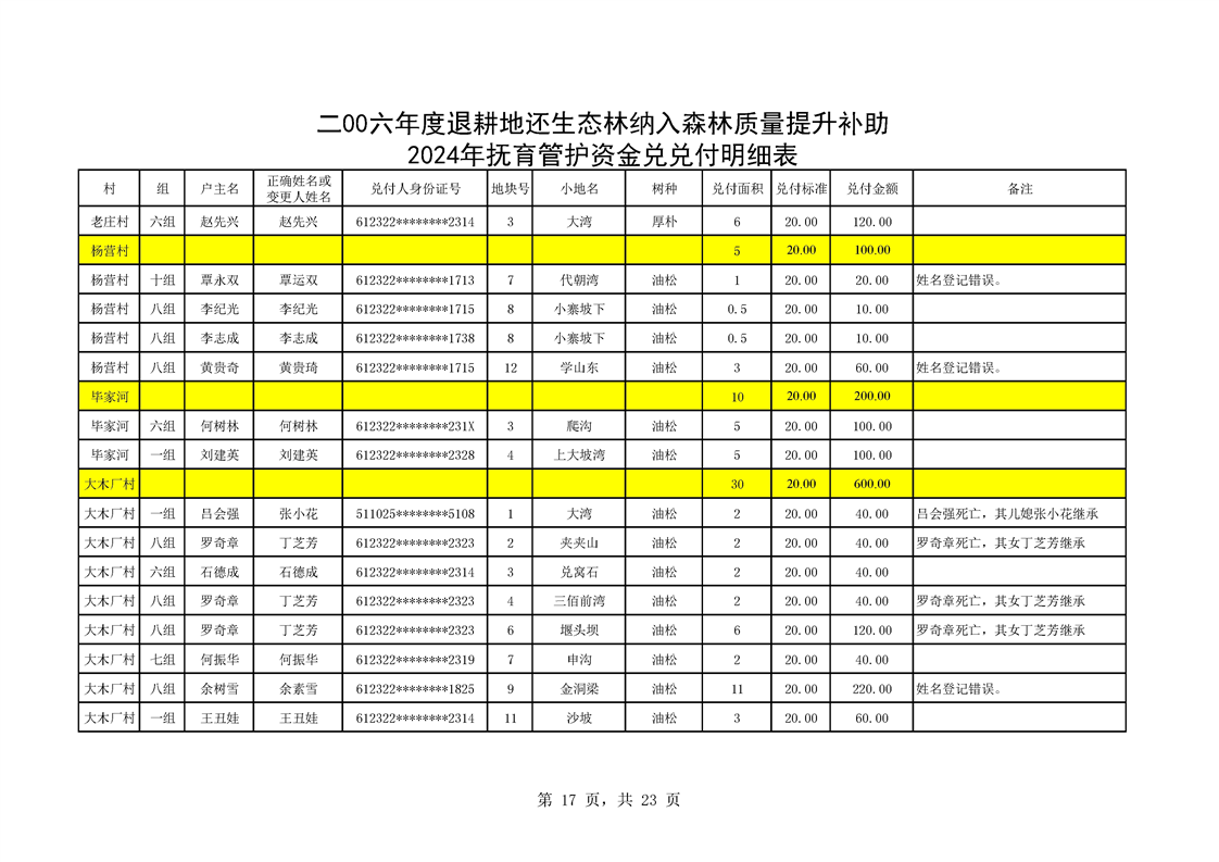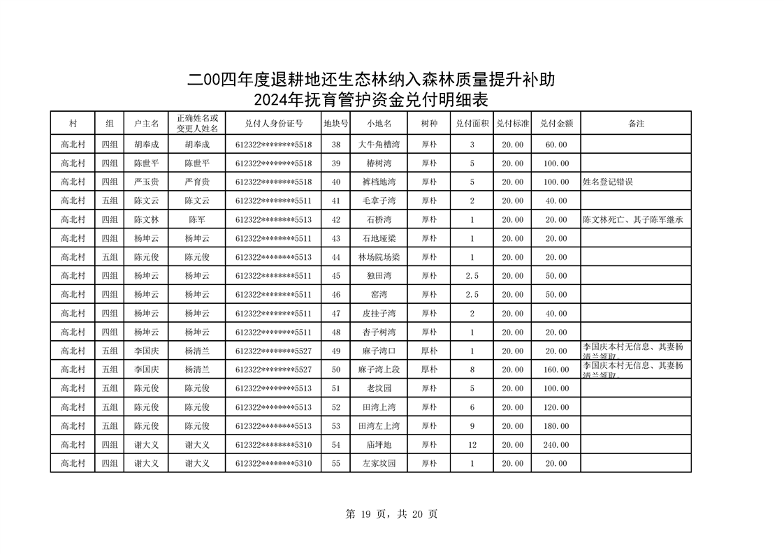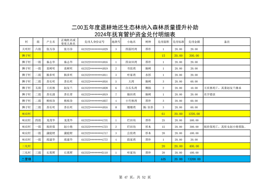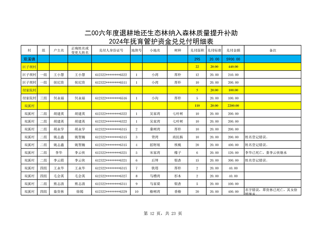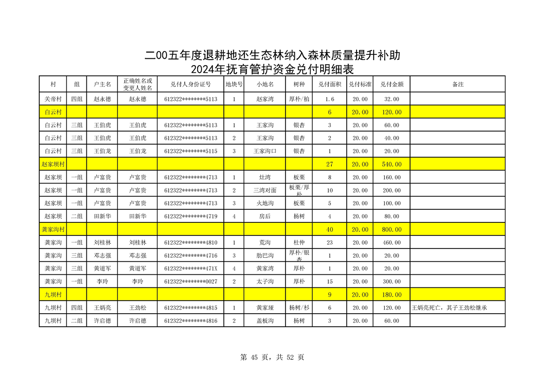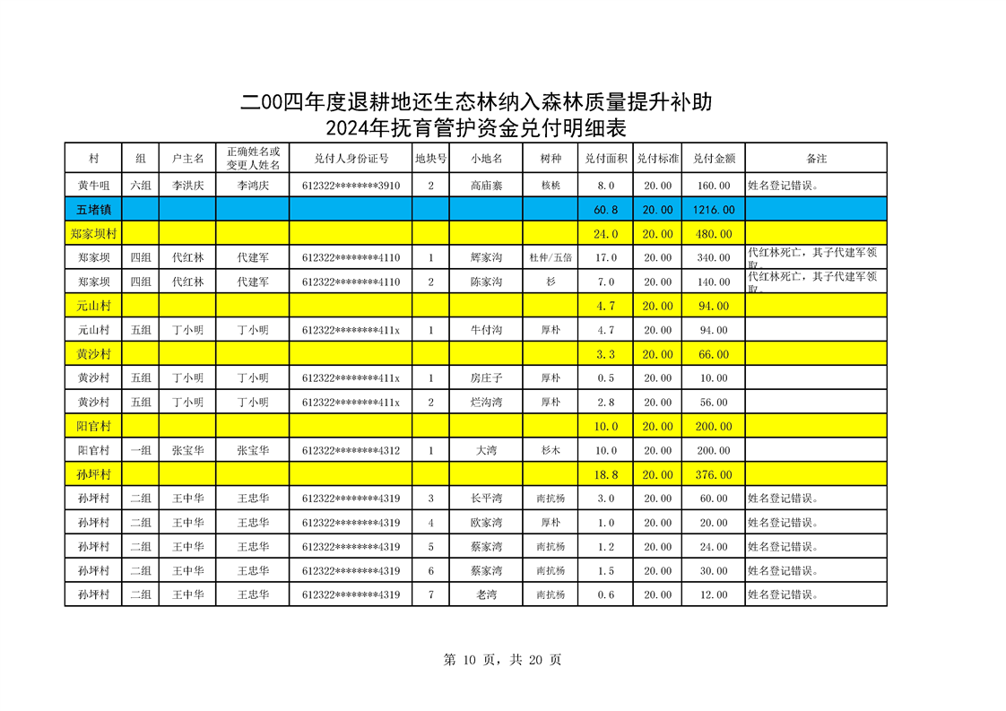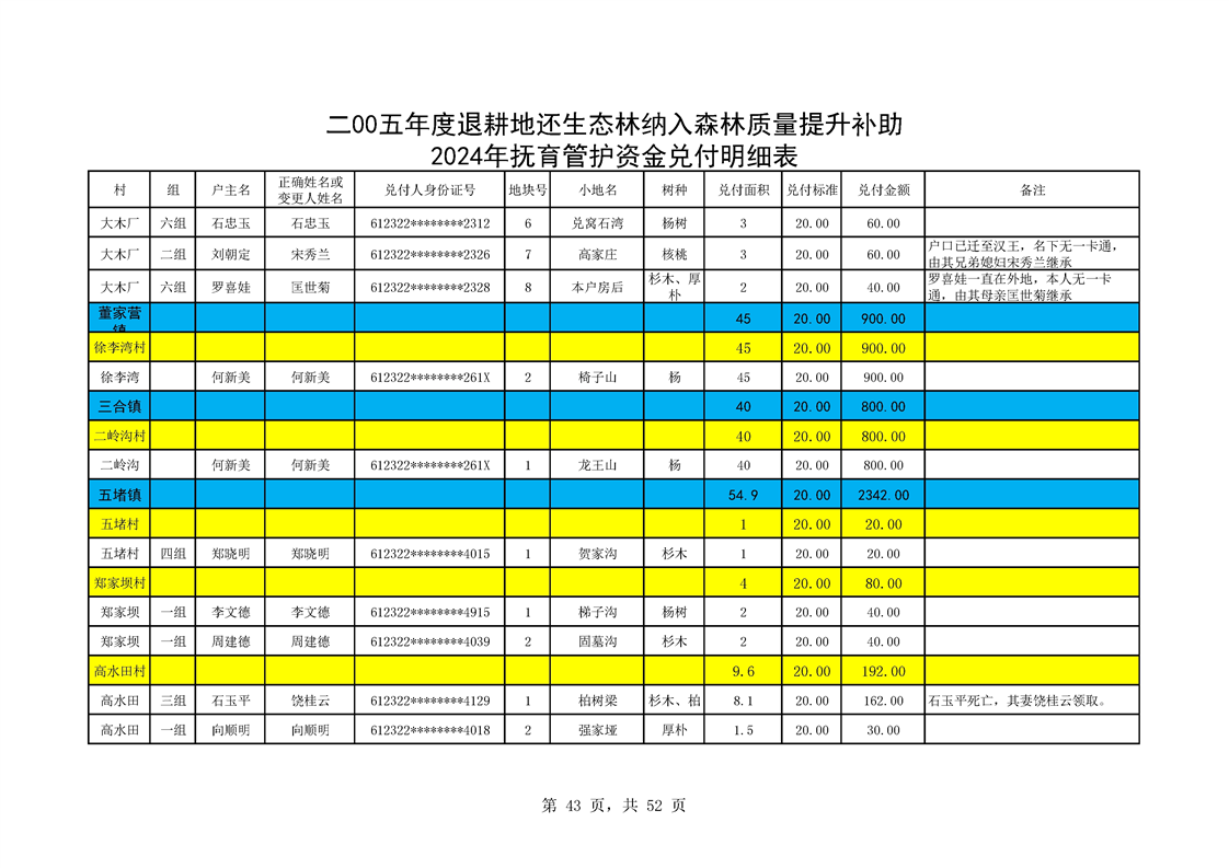 城固县林业局关于兑现2024年度上一轮退耕地还生态林森林质量提升补助资金发放明细公示