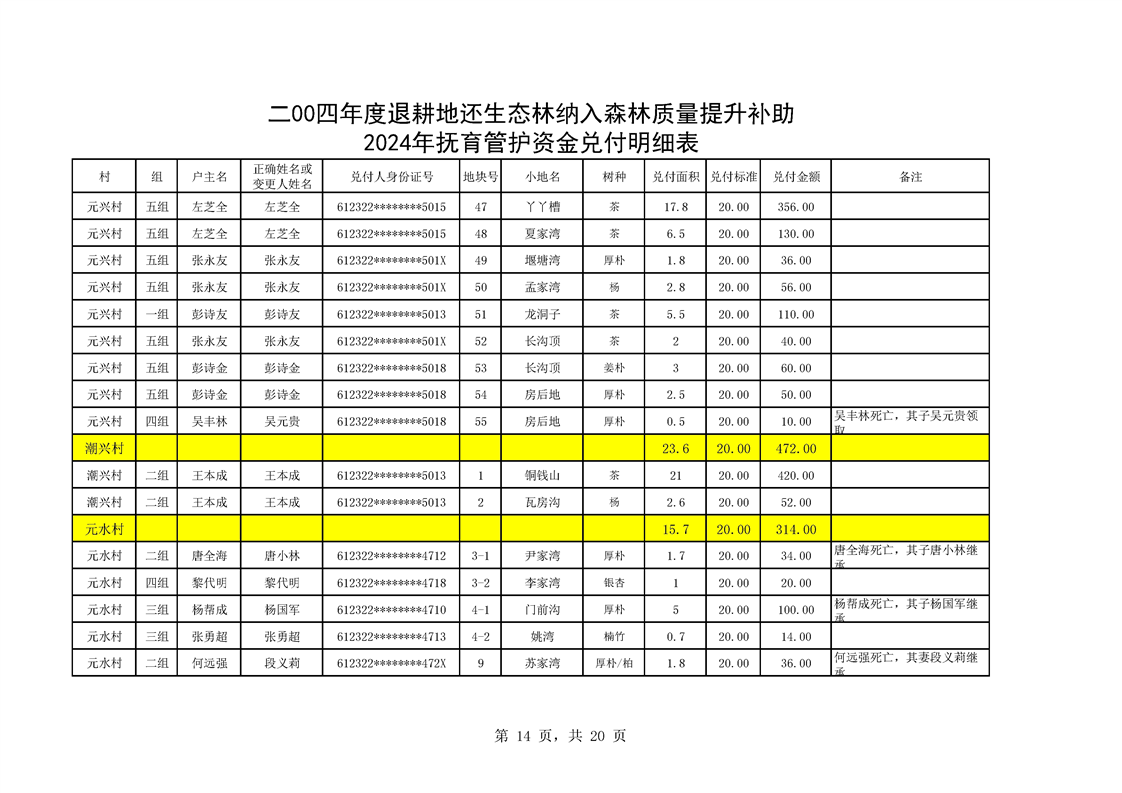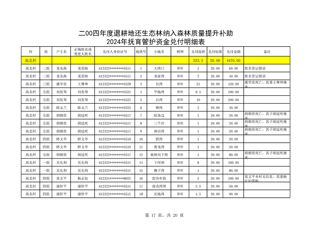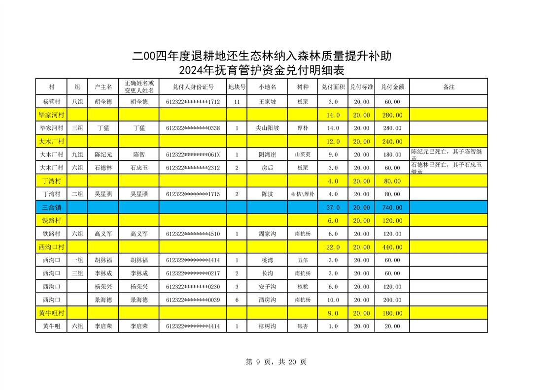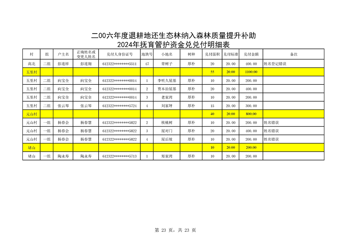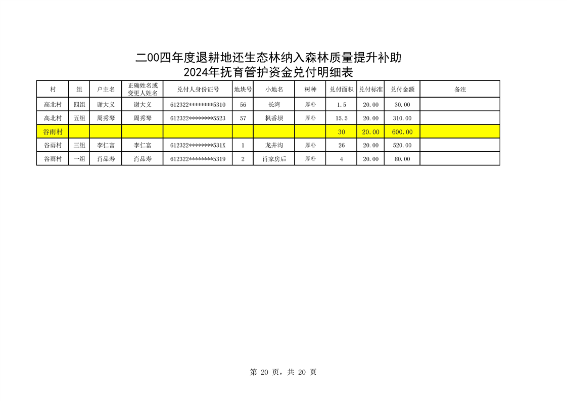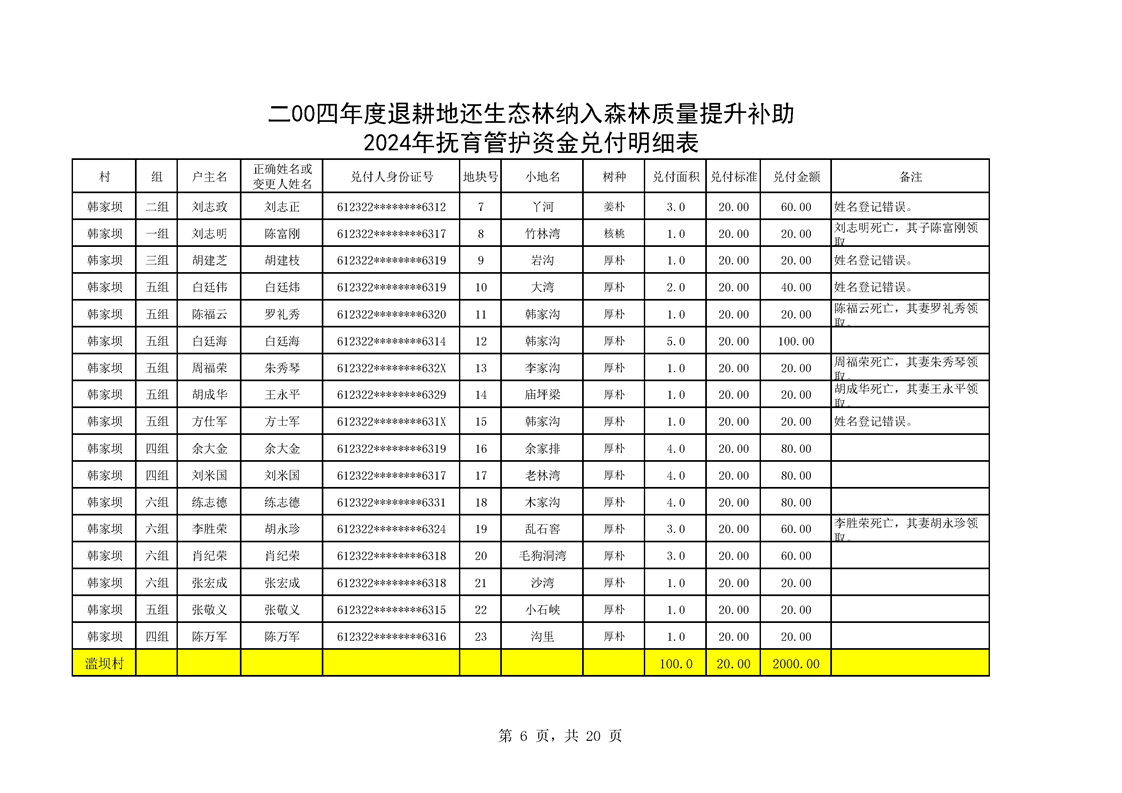 城固县林业局关于兑现2024年度上一轮退耕地还生态林森林质量提升补助资金发放明细公示