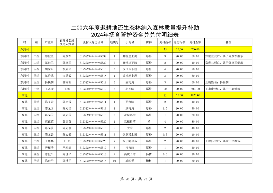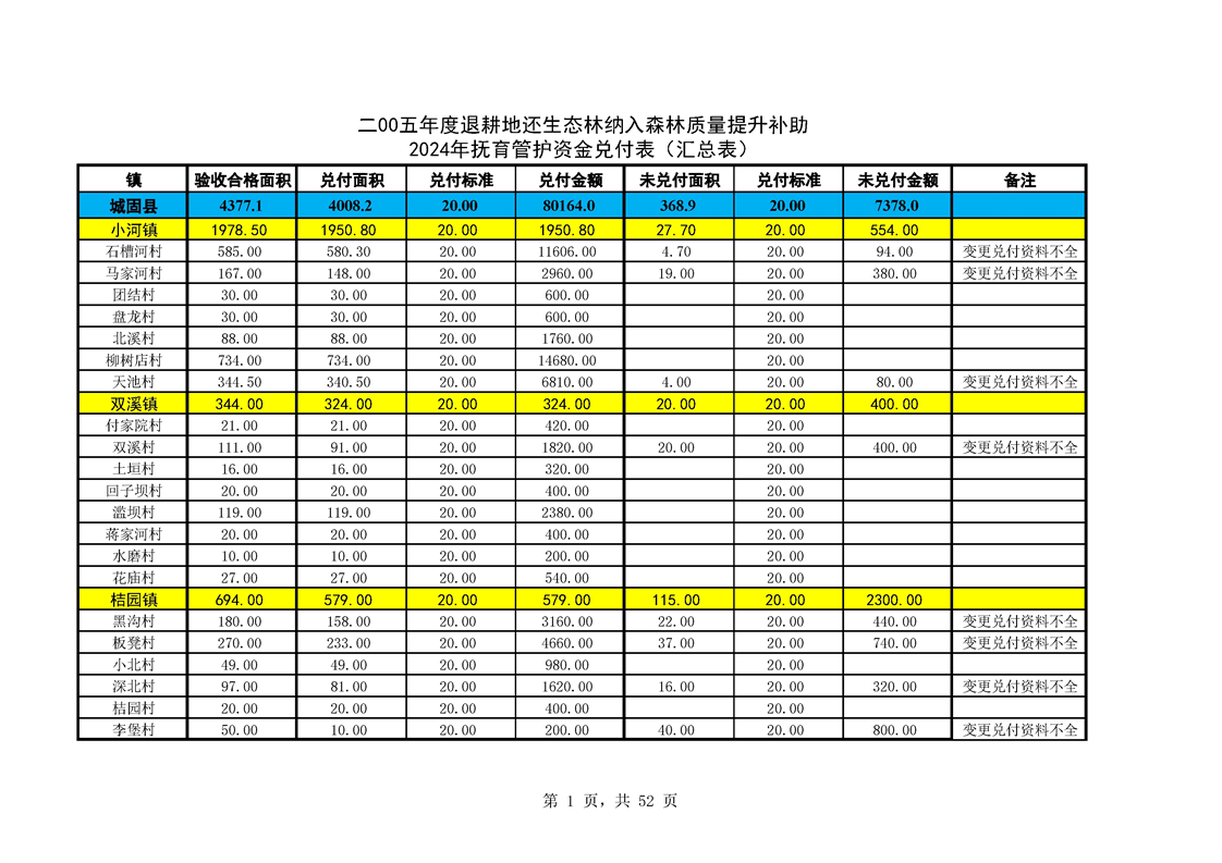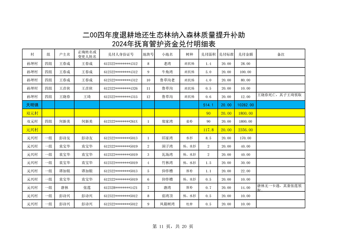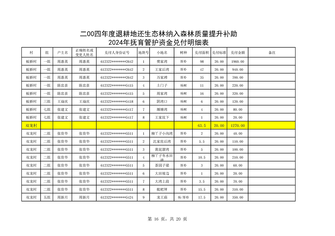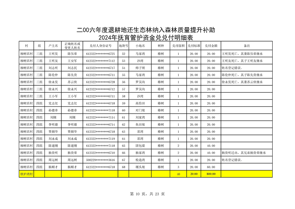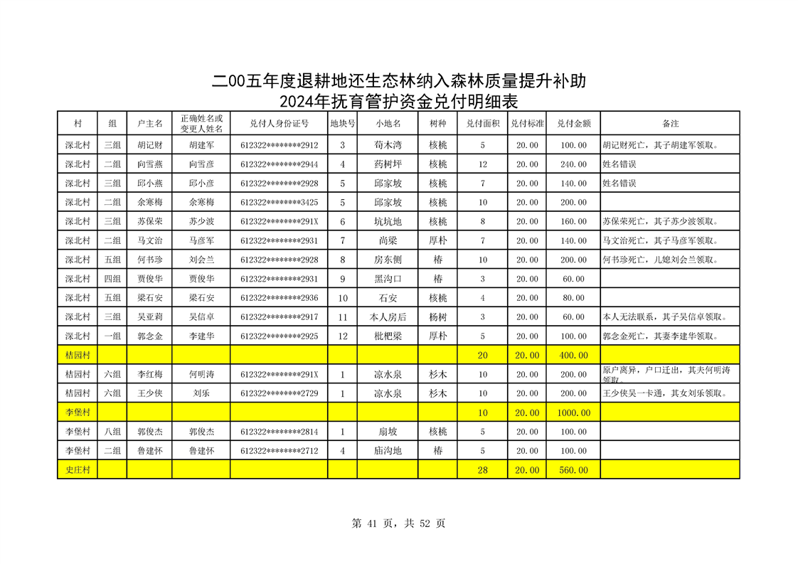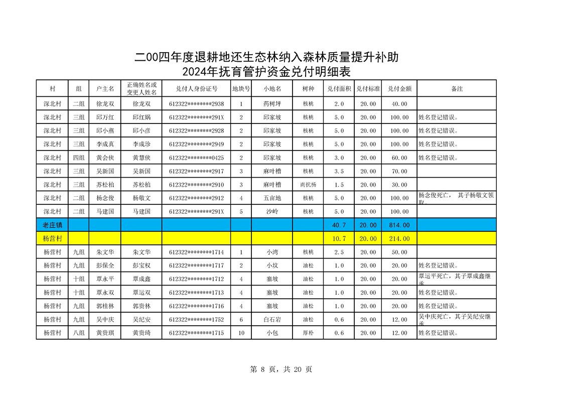城固县林业局关于兑现2024年度上一轮退耕地还生态林森林质量提升补助资金发放明细公示