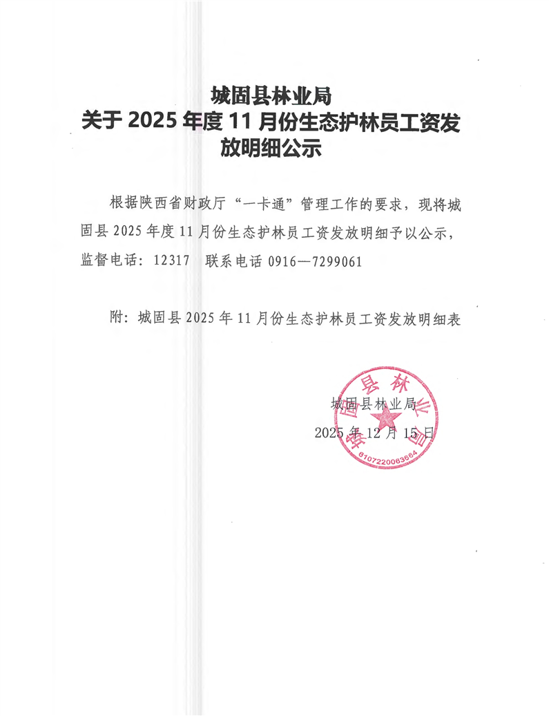 城固县林业局关于2025年度11月份生态护林员工资发放明细公示