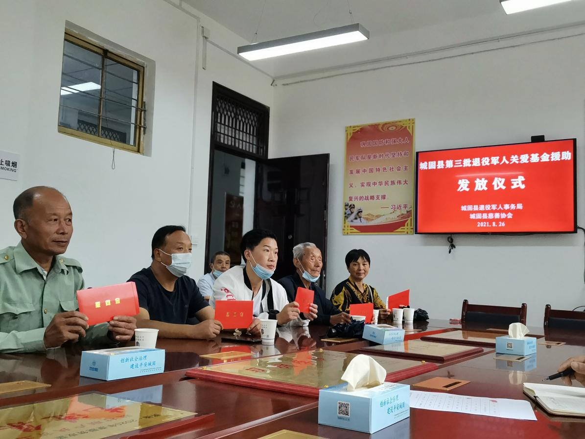 8月26日上午,城固县2021年度第三批退役军人关爱基金发放仪式在县退役军人事务局举行。此次为9户退役军人家庭共发放关爱基金1.8万元。副局长左华春主持仪式并讲话,退役军人事务局党组书记、局长,县退役军人服务中心主任董斌,困难退役军人家属参加了仪式。