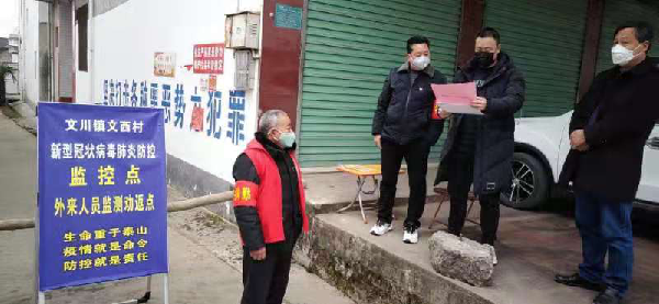 党员冲锋在前,汇成群防群治的强大力量。文川镇广大党员干部把疫情防控工作作为巩固拓展“不忘初心、牢记使命”主题教育成果的重要检验,设置党员先锋岗,悬挂党旗,在本职岗位上“戴党徽、亮身份、当先锋”,全力抓好各项疫情防控措施的落实。党员带头奋战在防控疫情斗争的第一线,关键时刻不畏艰险,敢于挺身而出,发挥表率作用,成为一面面鲜红的旗帜。一是全覆盖排查。在辖区严格落实网格化管理,分组划片联户排查,设定党员责任区,确保无盲区、无死角。镇领导班子成员分赴包抓村,与村党员干部一同,逐家逐户,开展疫情防控宣传工作,并送上口罩、体温计等防控物资。对湖北省、武汉市返乡或途径湖北省人员,进行详细摸排、登记、统计、造册、备案。对排查返乡的重点人员,对其逐一登记造册建档、签订承诺书、监测随诊和消毒隔离,安排党员24小时轮流监管,目前未发现疑似症状。二是无死角布防。在辖区设置监测点72个,每个监测点设置党员先锋岗,由镇卫生院、镇派出所、镇村干部、志愿者实行24小时值班值守,联合开展“人车双检”防控工作,主要察看入境车辆是否违规携带野生动物等违禁物品,对司乘人员进行体温测量,做到不漏一车、不漏一人,严密防控,筑牢抗御疫情的第一道坚固防线,确保文川辖区群众生命安全和身体健康。党员带头,村党组织发动村级巡逻队、乡贤、志愿者等开展联防联控,确保外来人员不进入,减少群众走动,做到守土尽责。三是全方位阻击。取消全镇春节期间计划组织举办的各类文化活动,集体聚会、聚餐以及朝天观、皇纯禅院、石羊寺、北极宫宗教活动等,杜绝群体性活动。对辖区内农贸市场、商店、饭店等全面清查,并做好消毒工作,确保市场干净,从源头杜绝细菌、病毒蔓延。文川镇移民新区管委会,加强对管委会的疫情防控,并设置车辆查问、体温检测,严格防控。并按照要求对辖区驻镇单位、公共区域和各村进行消杀。并发动群众开展人居环境卫生整治,清洁环境,抗击病毒。