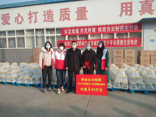2月12日上午陕西白云制药有限公司党组织向城固县红十字会捐赠抗击新型冠状病毒肺炎疫情物资活动在该公司举行了简短的捐赠仪式,城固县委常委、县政府副县长杨帆,城固县委组织部副部长、县基层办主任赖祥龙应邀参加仪式,县委组织部、县经贸局、县非公企业党工委和县红十字会的领导参加捐赠活动。本次捐赠物资有抗击新冠专用药物防风通圣丸、香菊片和饮用纯净水等价值30.56万元,成为城固县抗击新冠疫情以来捐赠金额最大的非公企业。