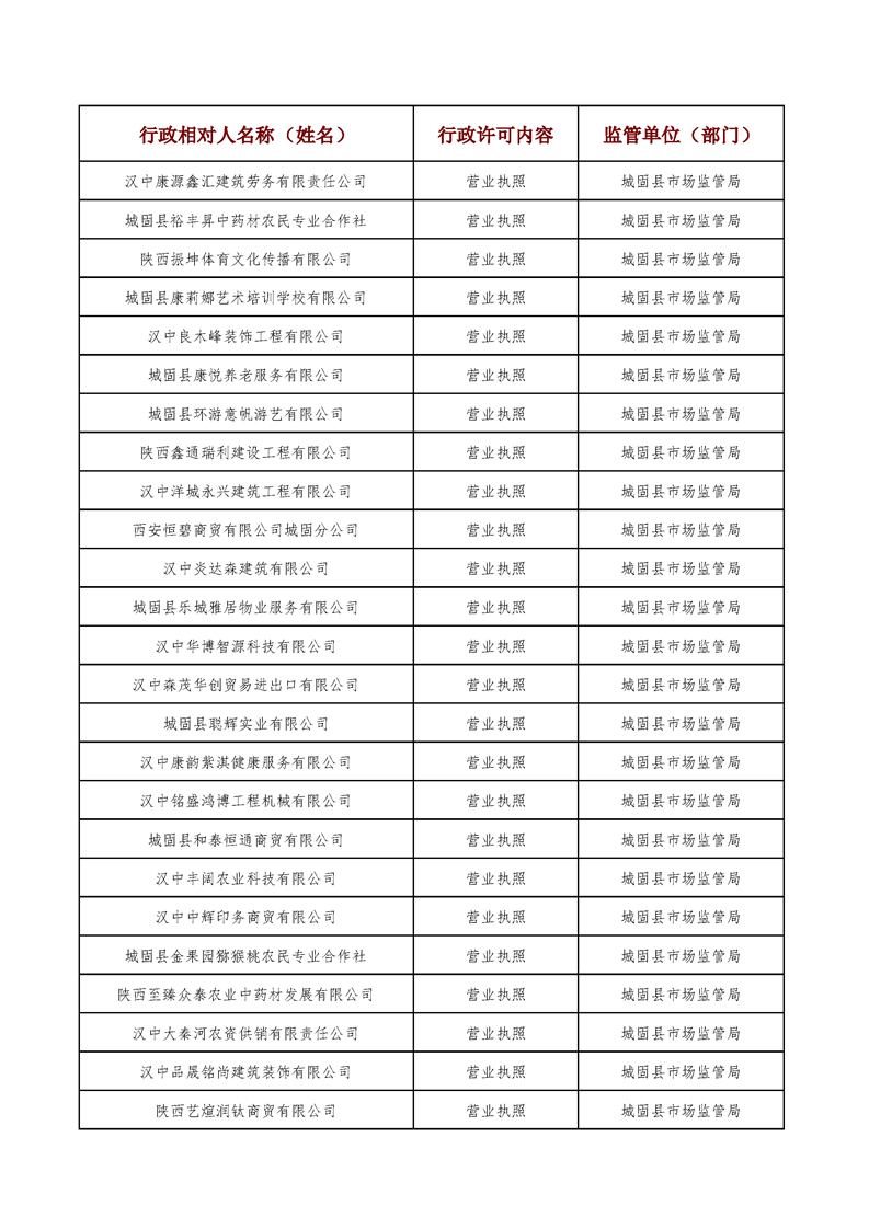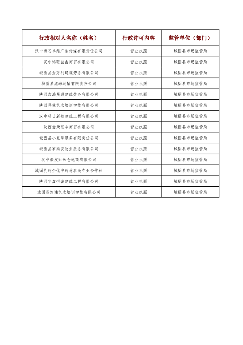 城固县行政审批服务局2024年9月1日至9月14日行政许可结果公开
