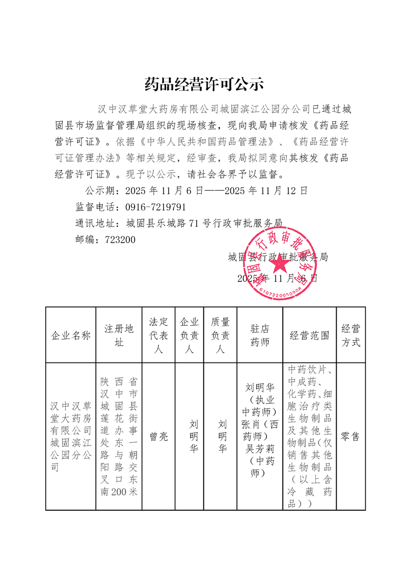汉中汉草堂大药房有限公司城固滨江公园分公司药品经营许可公示