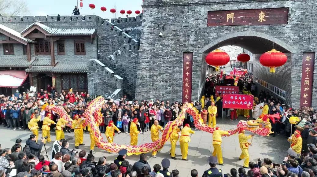 在上元观古镇东门,伴随着锣鼓喧天,金灿灿的舞龙追逐着龙珠,龙身时而盘旋、时而舒展,炯炯有神的大眼睛紧盯着金珠,表演了抱身舞龙、绕身舞龙等各种技巧动作,现场游客直呼“很棒、很棒、很棒”。随后南郑的春倌说春、勉县的五节龙、上元观镇各村的舞龙、舞狮、龙船等队伍浩浩荡荡的穿梭在古镇街道,不时驻足表演、与观众互动,一路上热热闹闹,让观众神摇目夺、争先恐后的拍照留念。