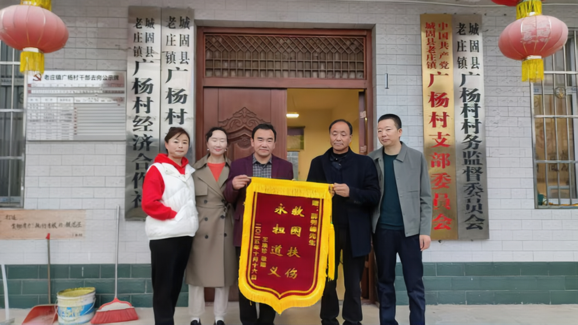 近日,老庄镇广杨村发生一起感人事迹。10月23日上午,一名老人家属专程前往广杨村村委会,向村副主任薛秀峰同志赠送印有"勇担道义 救困扶伤"字样的锦旗及感谢信,对其及时实施救援表示诚挚谢意。