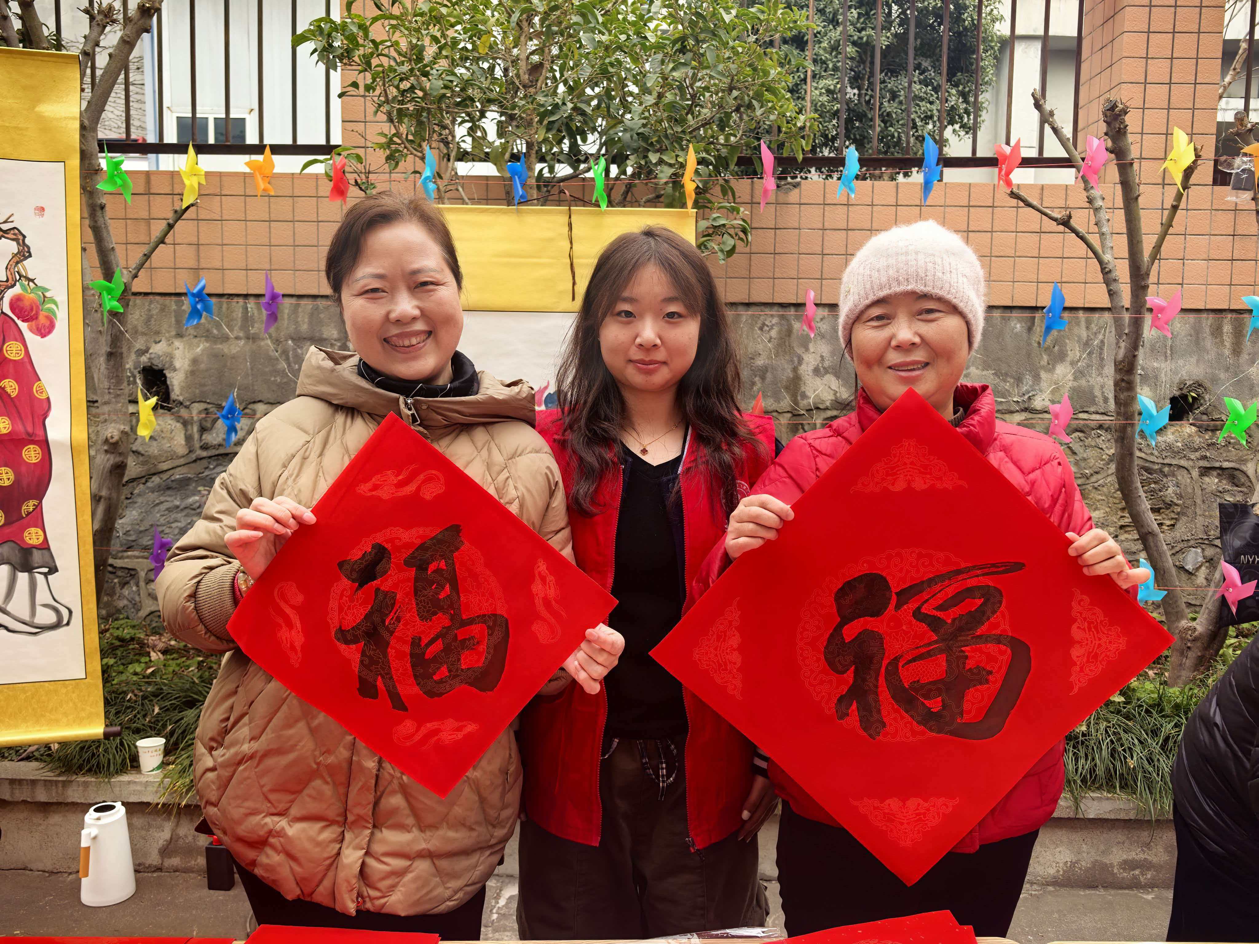 活动现场暖意融融、墨香四溢,社区党支部提前布置好场地、备好红纸、笔墨等物资,邀请辖区书法爱好者与社区党员志愿者同台挥毫、现场创作。书法老师们凝神聚气,提笔落墨间,一副副寓意吉祥、饱含新春祝福的春联跃然纸上,一个个遒劲有力、红红火火的“福”字鲜活灵动,既有“春归大地人间暖,福降神州喜事多”的美好期许,也有“平安喜乐万事顺,阖家幸福年年好”的温馨祝愿,每一幅作品都承载着对新年的憧憬,传递着浓浓的真情。