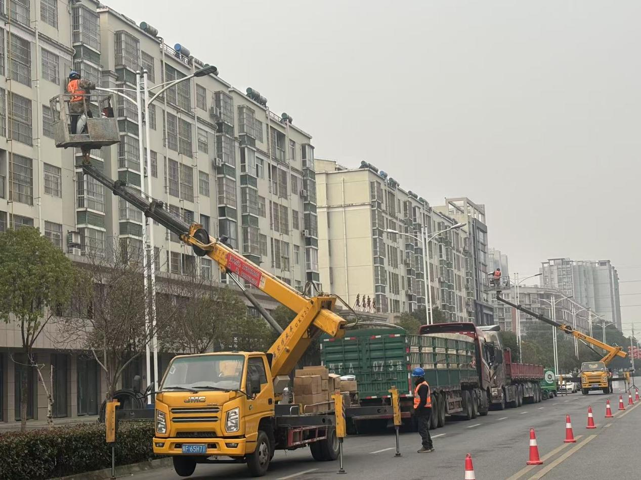 施工现场,高空作业车伸展长臂,稳稳托举施工人员至灯杆高处。拆卸旧具、整理线路、安装新灯、调试运行,工人们分工明确、配合娴熟,每一道工序都严格对标施工规范,确保每一盏路灯点亮即达标。本次更换的LED灯具,从选型到布点均经过科学测算,照明亮度较旧灯提升70%,能耗下降60%,真正实现“更亮、更省、更绿”。