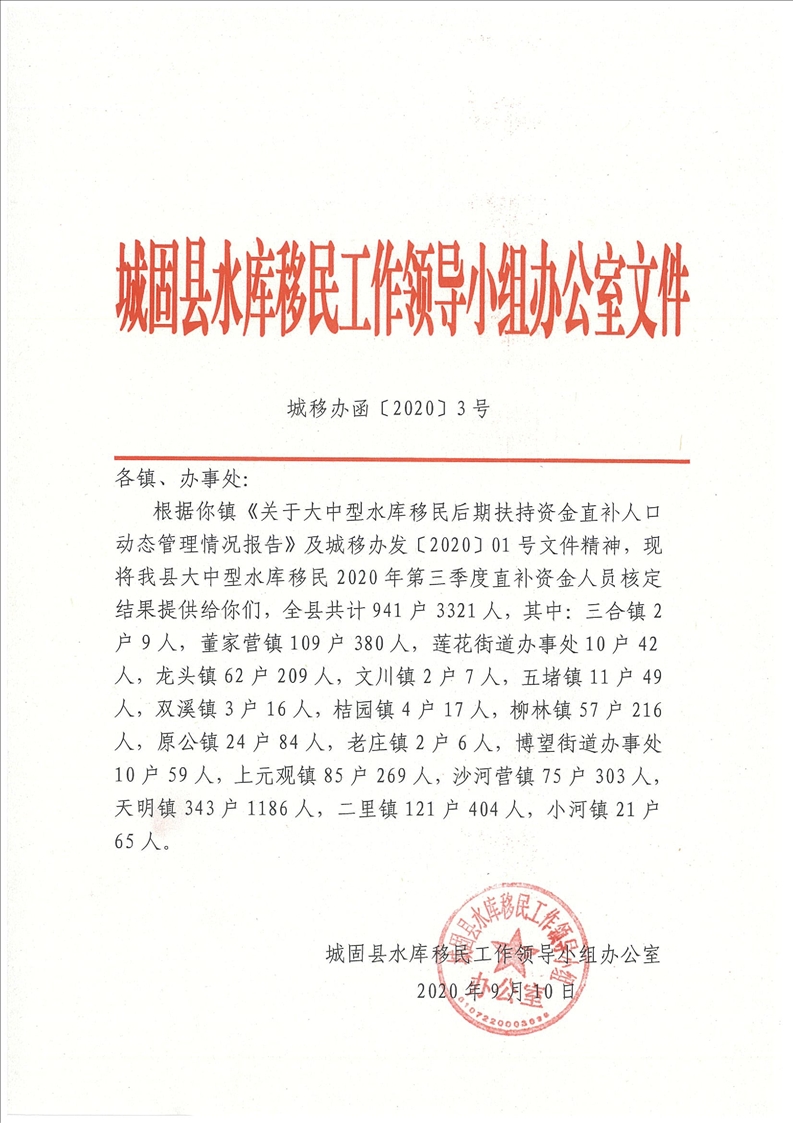 城固县2020年第三季度大中型水库移民直补资金结果公示