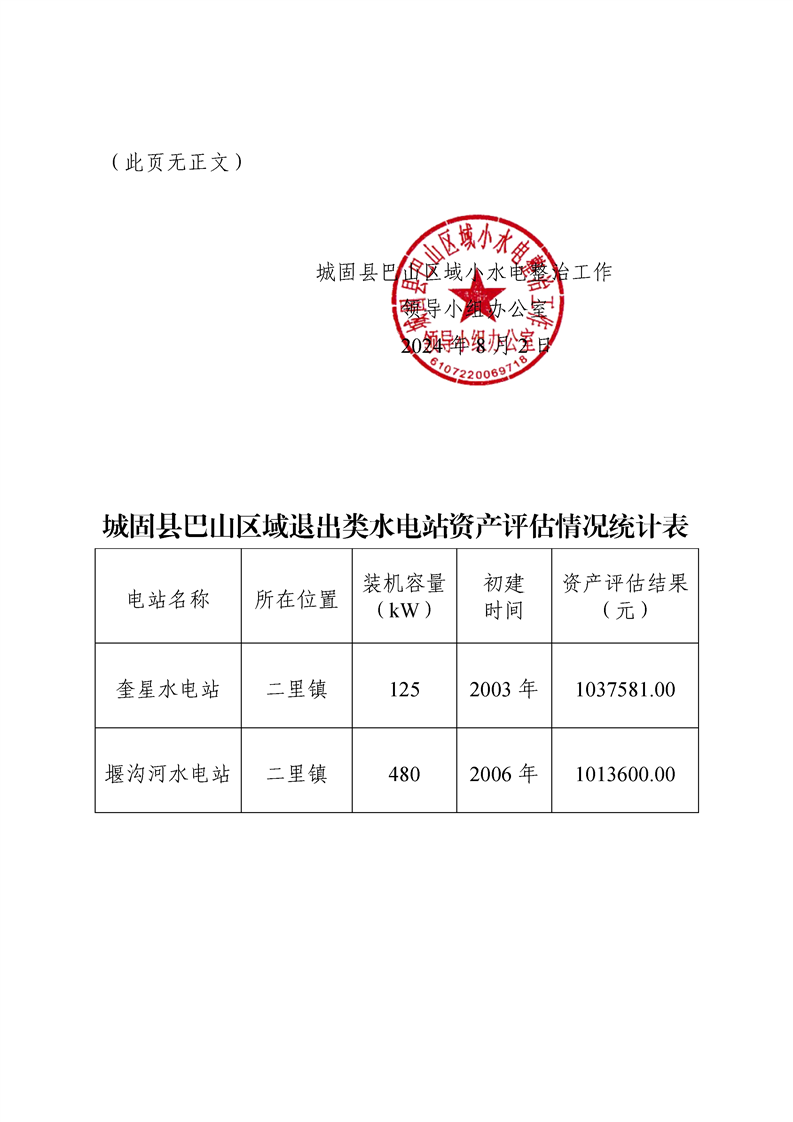 城固县巴山区域小水电整治工作领导小组办公室关于城固县巴山区域退出类堰沟河、奎星水电站资产评估情况的公示