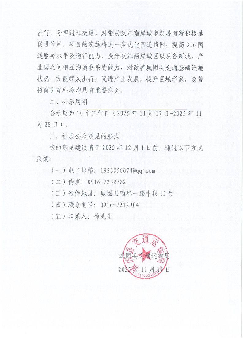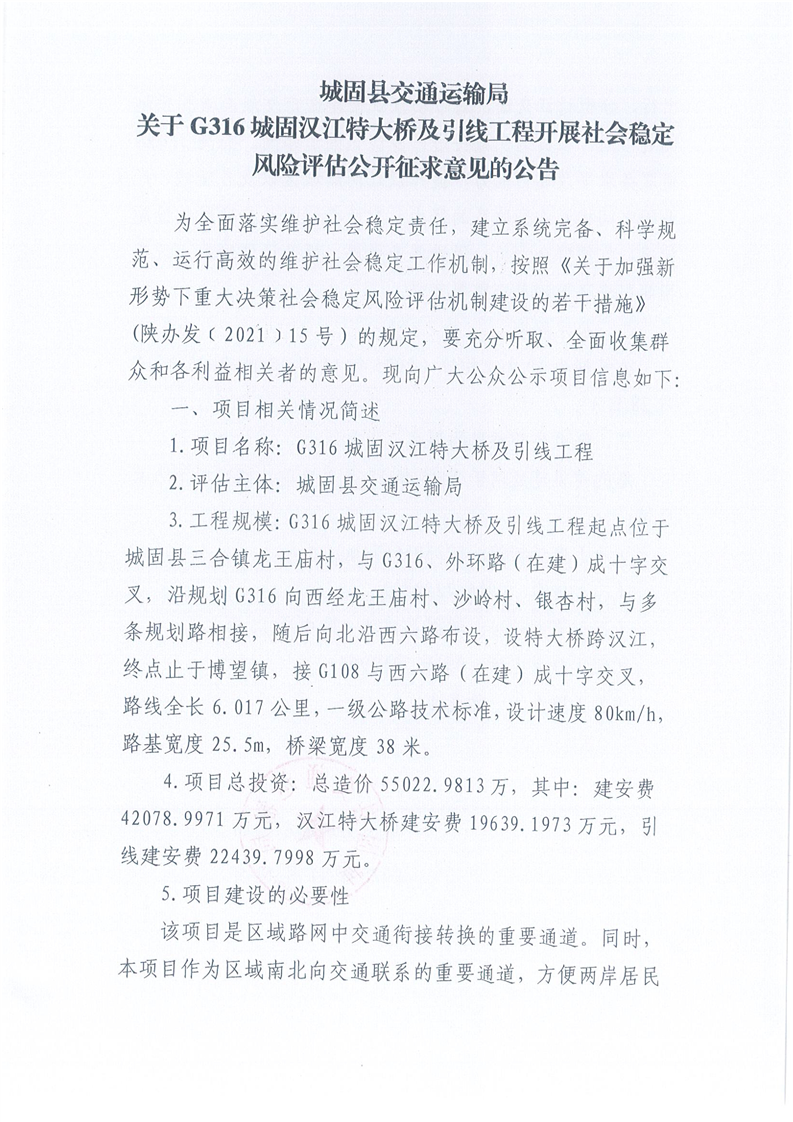 城固县交通运输局关于G316城固汉江特大桥及引线工程开展社会稳定风险评估公开征求意见的公告