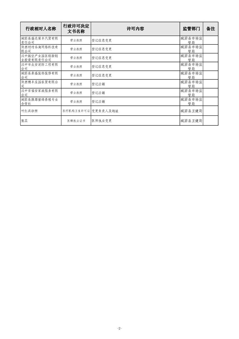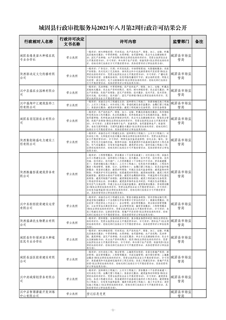 城固县行政审批服务局2021年八月第2周行政许可结果公开
