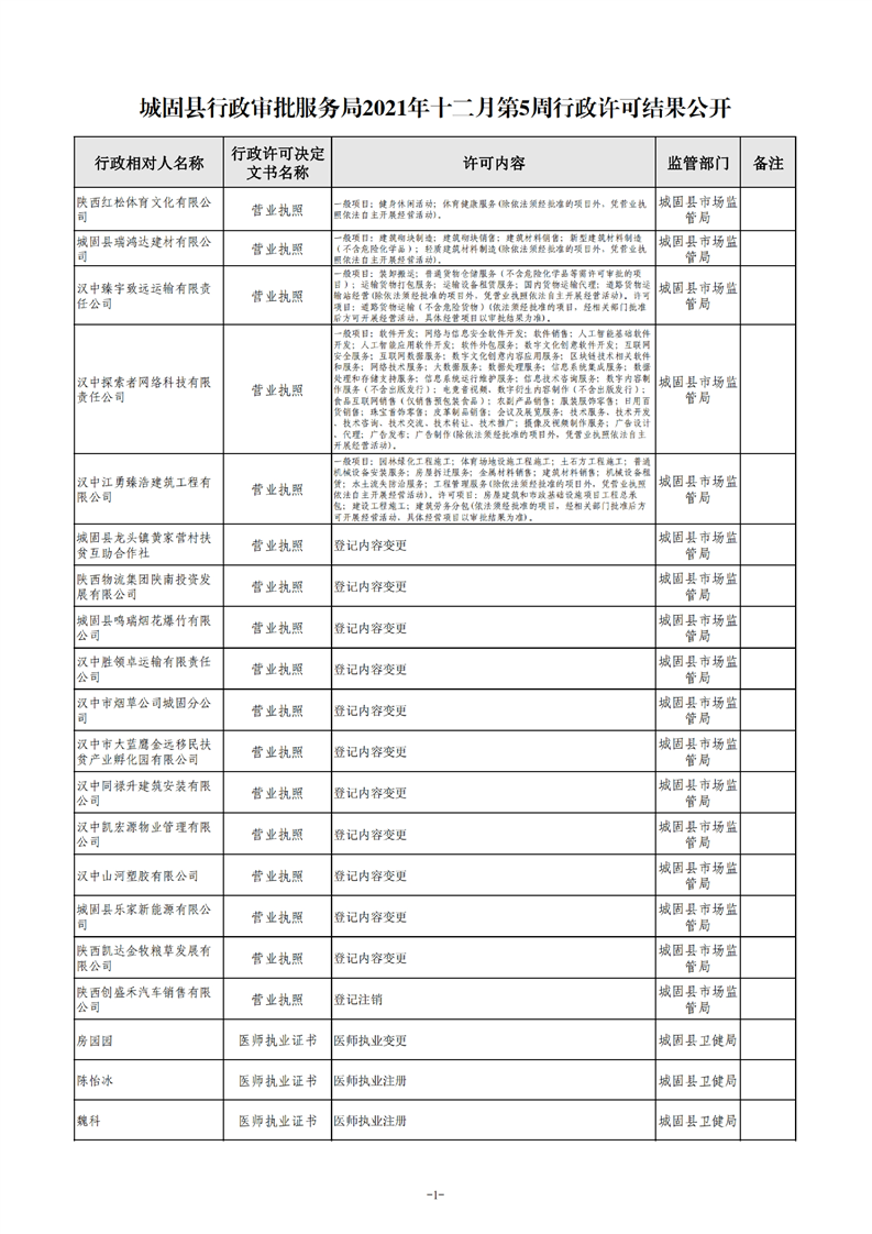 城固县行政审批服务局2021年十二月第5周行政许可结果公开