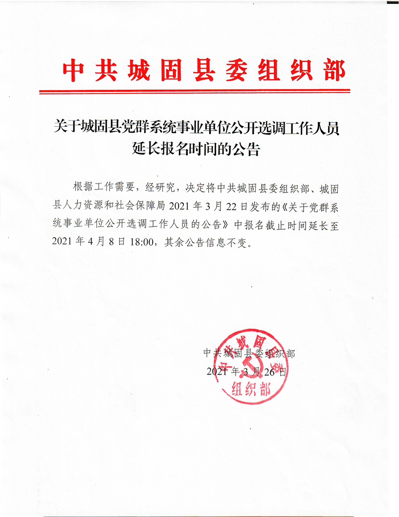 关于城固县党群系统事业单位公开选调工作人员延长报名时间的公告