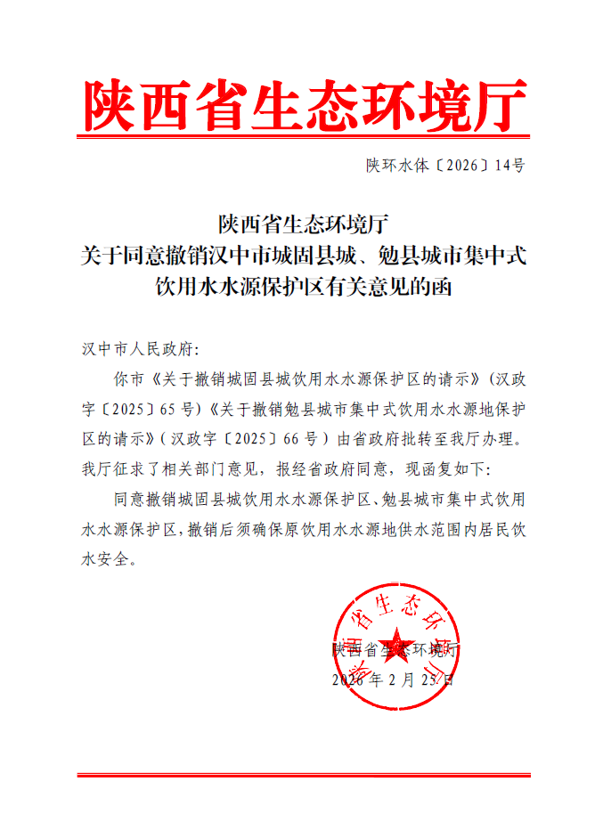 陕西省生态环境厅关于同意撤销汉中市城固县城、勉县城市集中式饮用水水源保护区有关意见的函