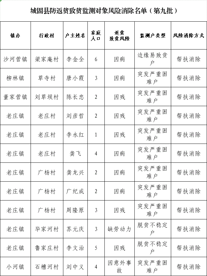 按照《城固县健全防止返贫动态监测和帮扶机制实施细则》要求,经入户核实、村级评议、镇(街道)审核、县级审定,最终确定防返贫致贫监测户风险消除12户37人,现将名单予以公告。
