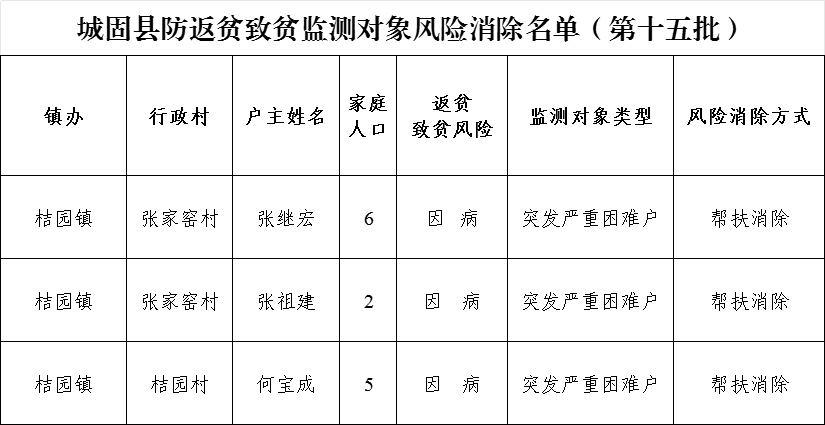 按照《城固县健全防止返贫动态监测和帮扶机制实施细则》要求,经入户核实、村级评议、镇(街道)审核、县级审定,最终确定防返贫致贫监测户风险消除3户13人,现将名单予以公告。