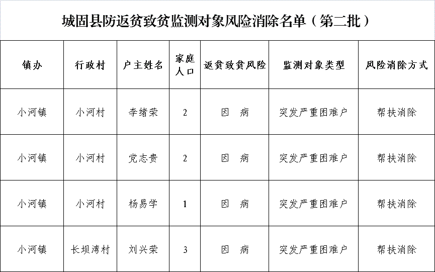 按照《城固县健全防止返贫动态监测和帮扶机制实施细则》要求,经入户核实、村级评议、镇(街道)审核、县级审定,最终确定防返贫致贫监测户风险消除4户8人,现将名单予以公告。