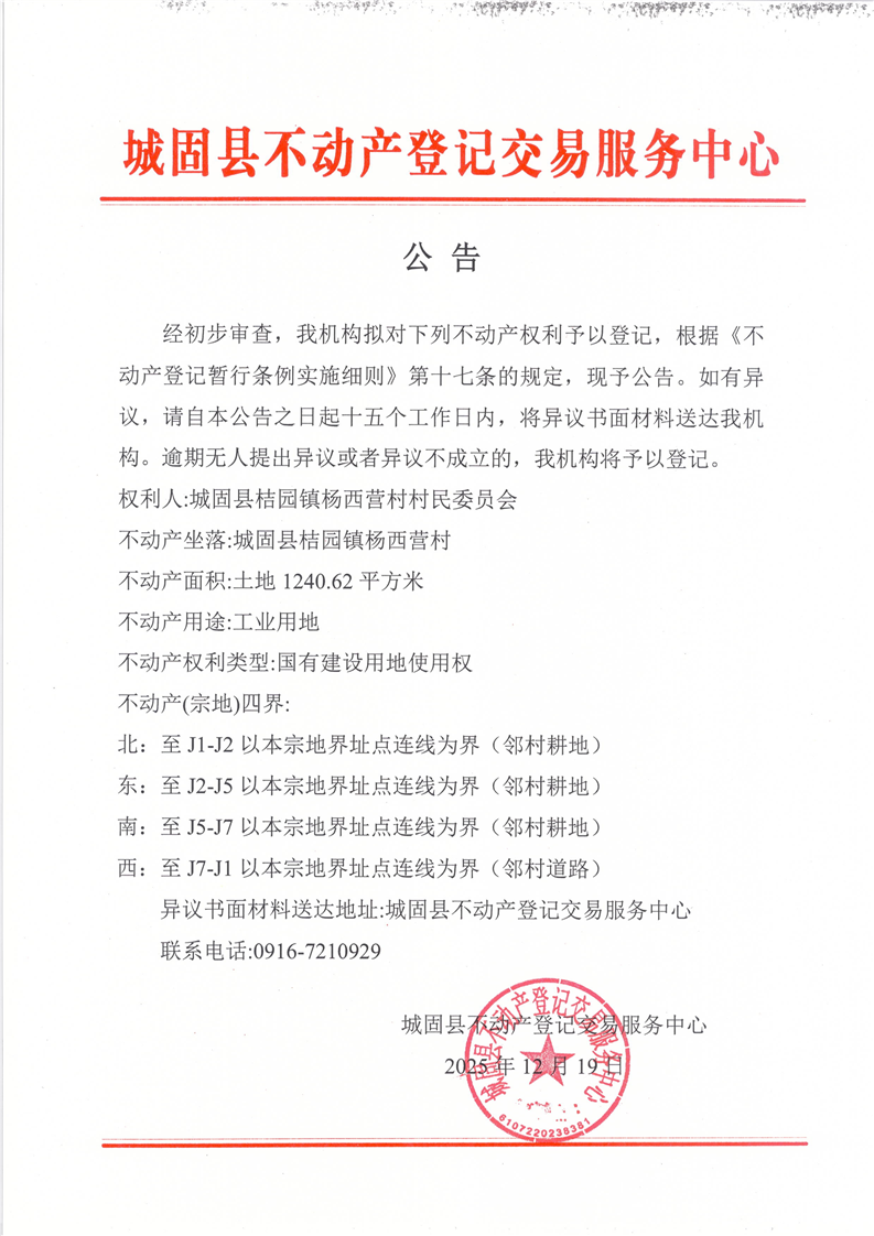 关于桔园镇杨西营村村民委员会使用土地的公告
