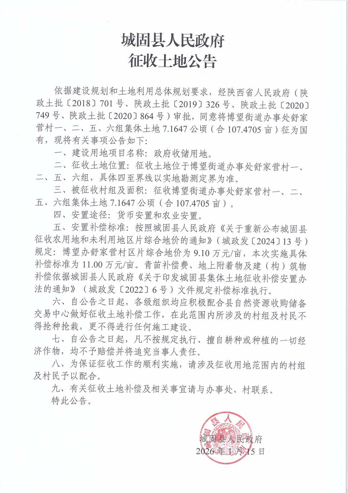城固县人民政府征收土地公告