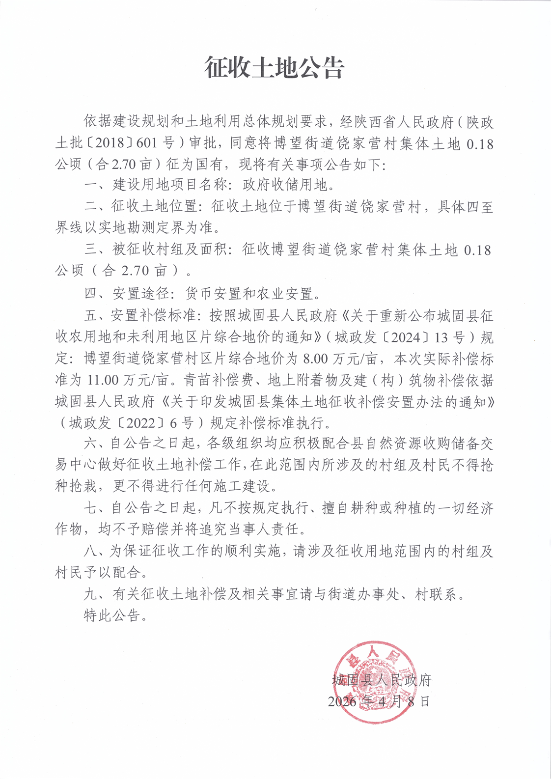 征收土地公告(博望街道饶家营村)