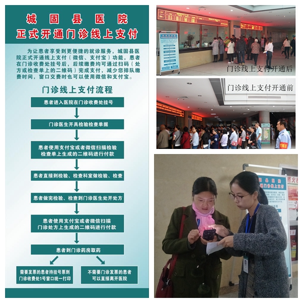 拿出手机,打开支付宝或微信对着处方或检查单上的二维码扫一扫,即可瞬间完成缴费,患者可直接去药房取药或去检查科室做检查。城固县医院于2018年11月10日在全市率先开通门诊微信、支付宝缴费服务。