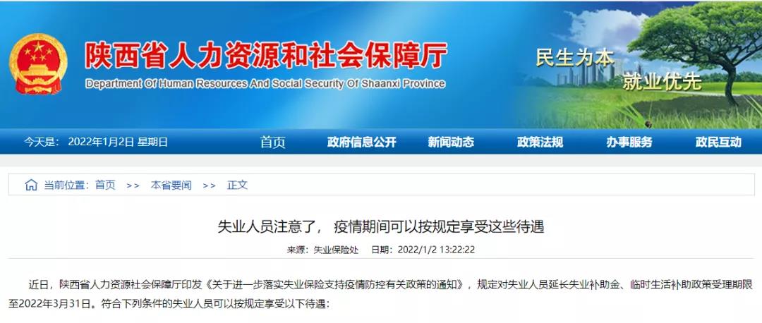 近日,陕西省人力资源社会保障厅印发《关于进一步落实失业保险支持疫情防控有关政策的通知》,规定对失业人员延长失业补助金、临时生活补助政策受理期限至2022年3月31日。符合下列条件的失业人员可以按规定享受以下待遇: