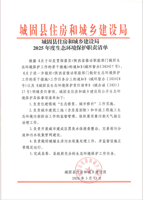 城固县住房和城乡建设局2025年度生态环境保护职责清单