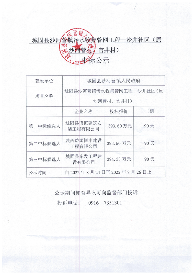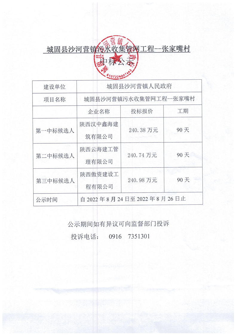 沙河营镇沙井社区、张家嘴村污水收集管网工程中标公示