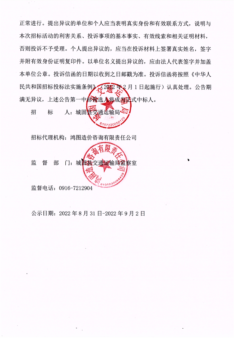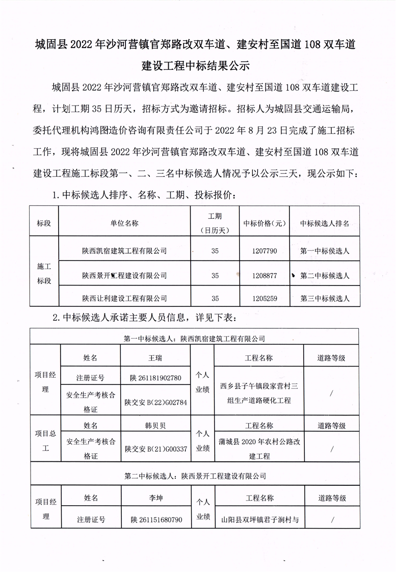 城固县2022年沙河营镇官郑路改双车道、建安村至国道108双车道建设工程中标结果公示