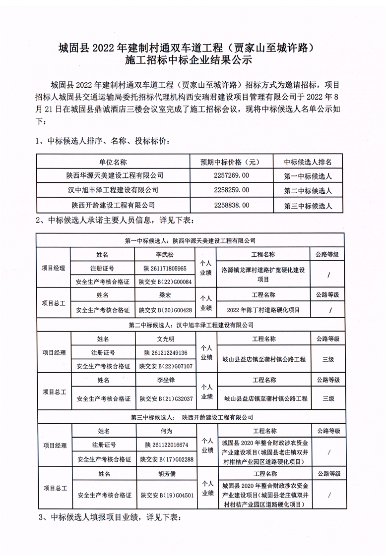 城固县2022年建制村通双车道工程(贾家山至城许路)施工招标中标企业结果公示