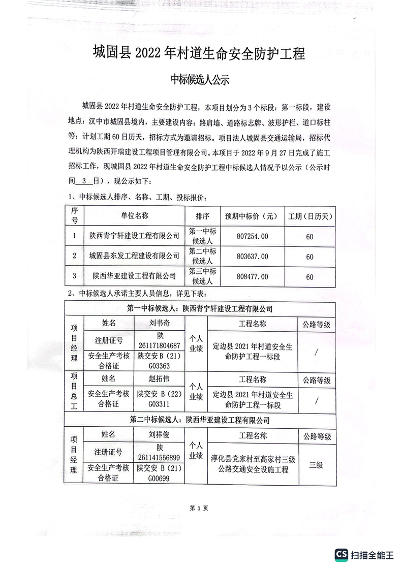 城固县2022年村道生命安全防护工程第一标段(小河桥-柳树店)(柳树店-月溪沟)(梁家窝文东)(张家窑-陈家弯)(陈村-常家沟)(宝山-郭家村)中标公示