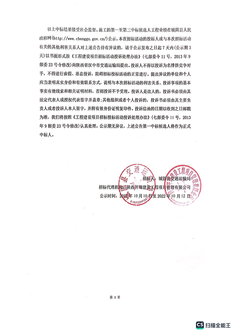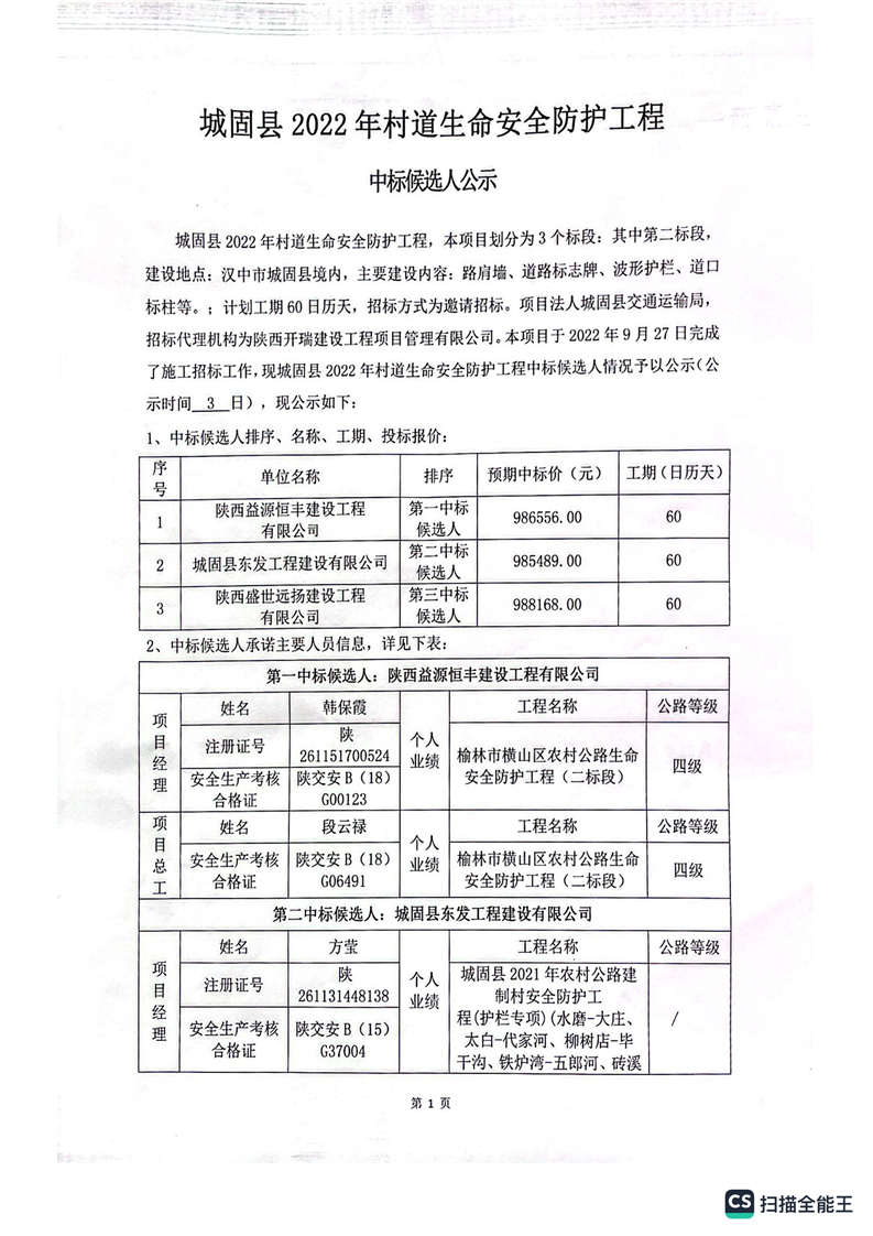 城固县2022年村道生命安全防护工程第二标段(赵庙-新元五队)(元兴-金竹)(元坝-长沟)中标公示