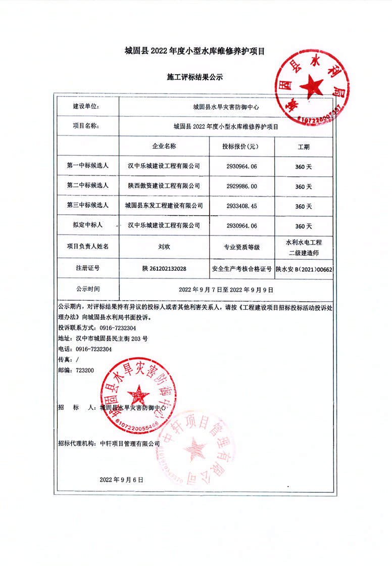 城固县2022年度小型水库维修养护项目施工评标结果公示