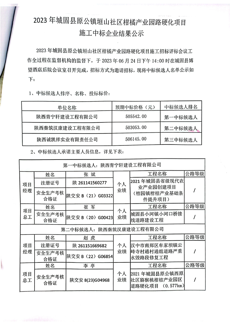 2023年城固县原公镇垣山社区柑橘产业园路硬化项目施工中标企业结果公示