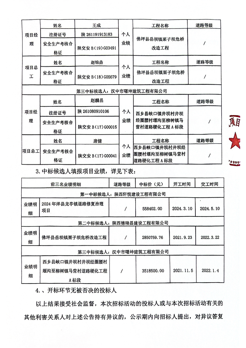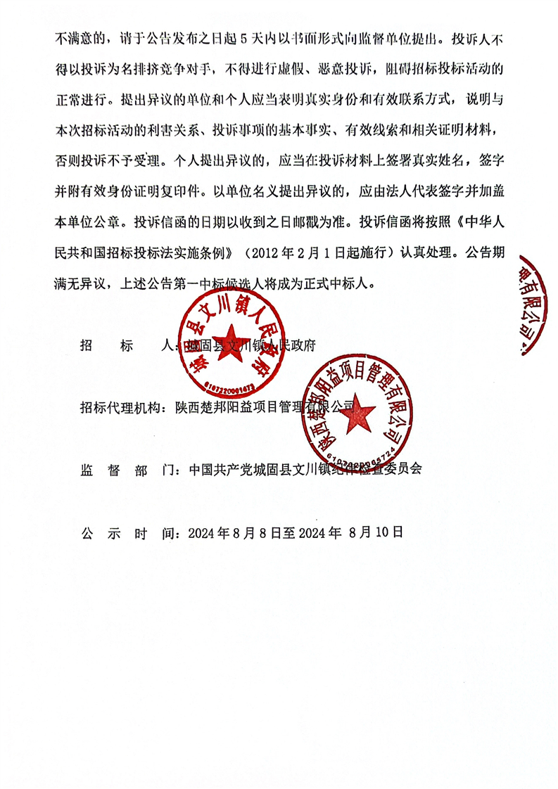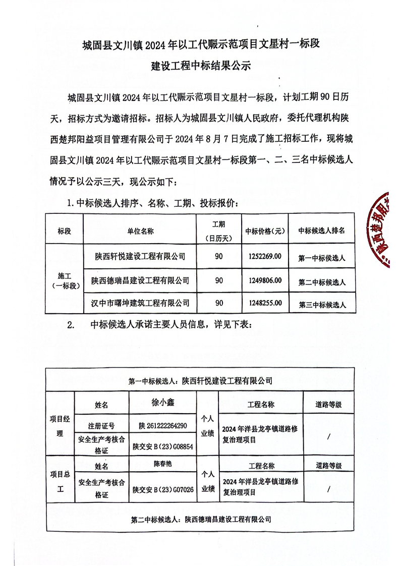 城固县文川镇2024年以工代赈示范项目文星村一标段建设工程中标结果公示