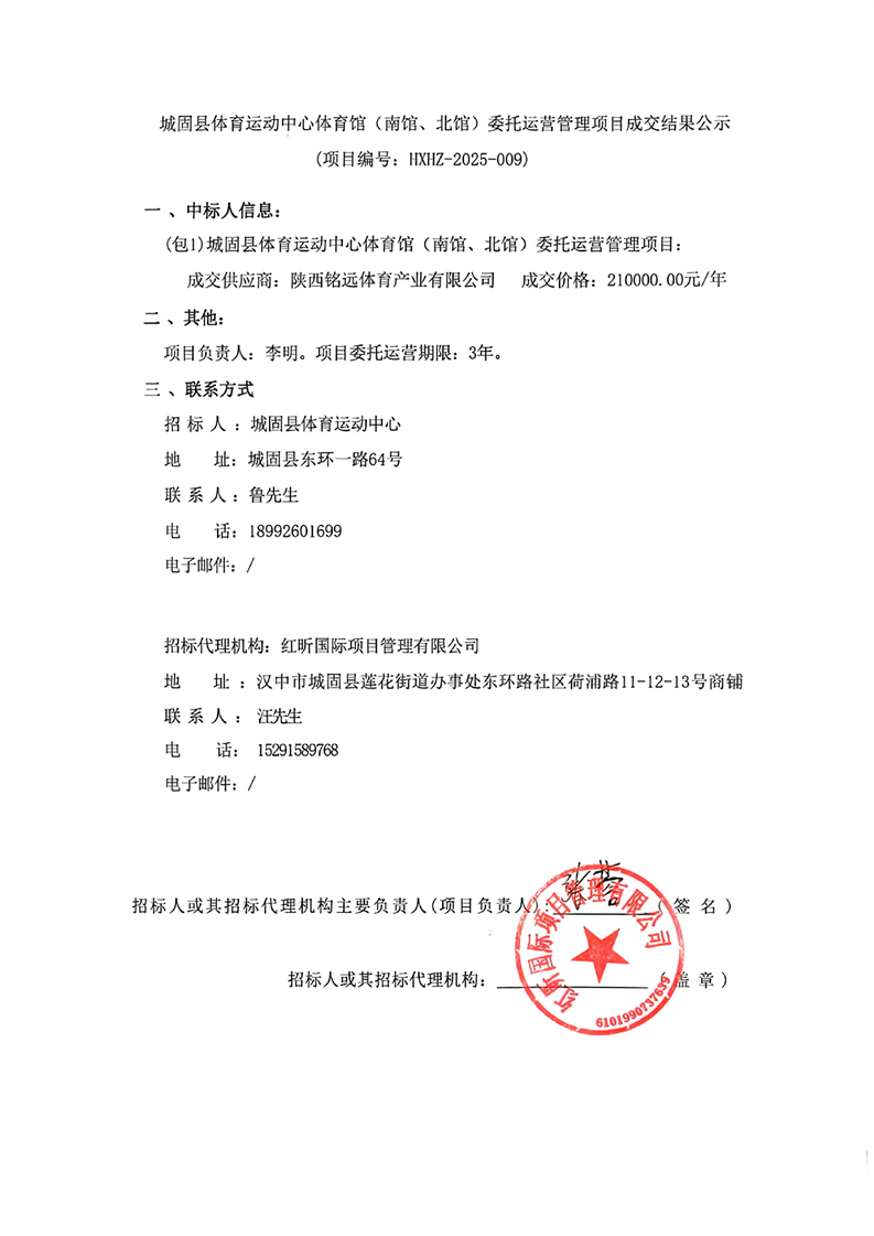 城固县体育运动中心体育馆(南馆、北馆)委托运营管理项目成交结果公示