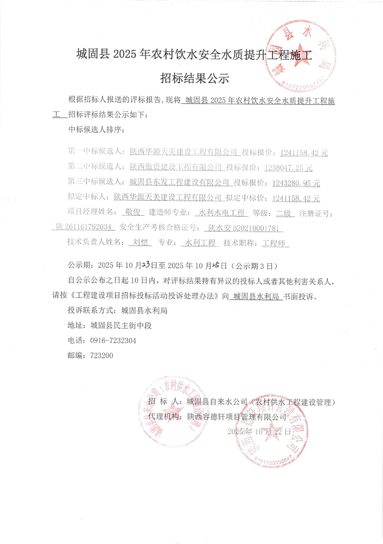 城固县2025年农村饮水安全水质提升工程施工招标结果公示