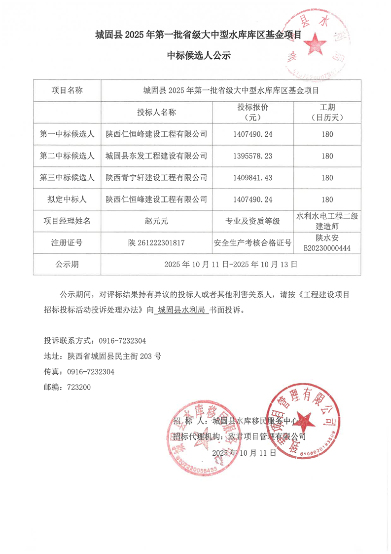 城固县2025年第一批省级大中型水库库区基金项目中标候选人公示