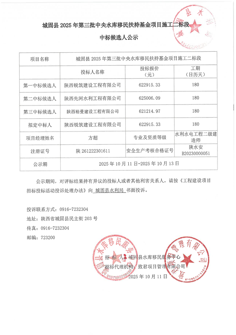 城固县2025年第三批中央水库移民扶持基金项目施工二标段中标候选人公示